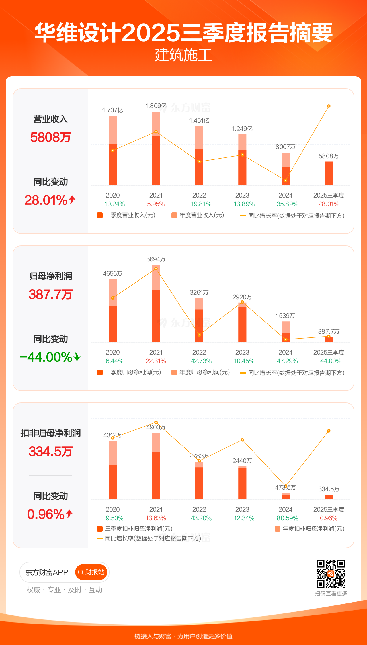 华维设计10月29日发布2025年三季报显示,公司前三季实现营业收入5808.26万元,同比增长28.01%;归母净利润387.69万元,同比下滑44.00%;扣非归母净利润334.49万元,同比增长0.96%。