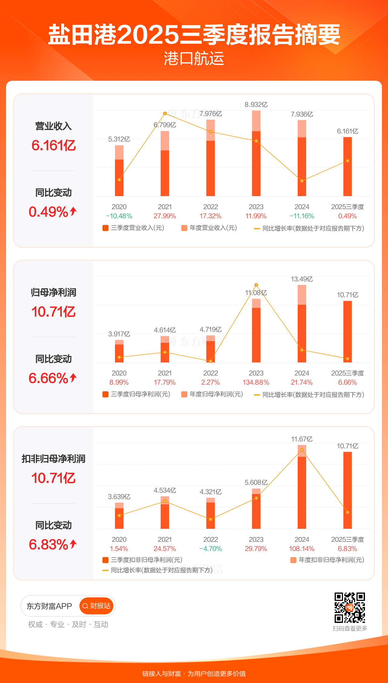 盐田港10月30日发布2025年三季报显示,公司前三季实现营业收入6.16亿元,同比增长0.49%;归母净利润10.71亿元,同比增长6.66%;扣非归母净利润10.71亿元,同比增长6.83%。
