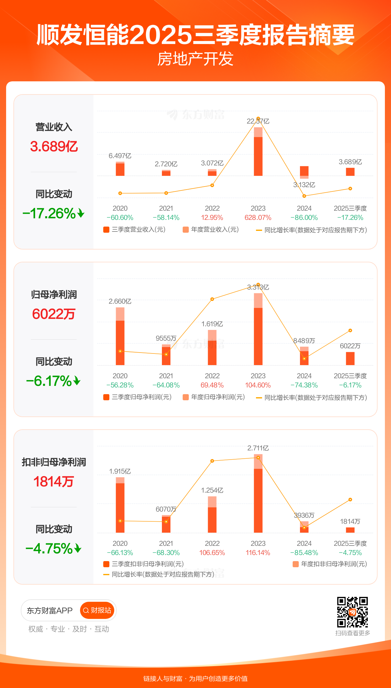 顺发恒能10月30日发布2025年三季报显示,公司前三季实现营业收入3.69亿元,同比下滑17.26%;归母净利润6021.94万元,同比下滑6.17%;扣非归母净利润1813.84万元,同比下滑4.75%。