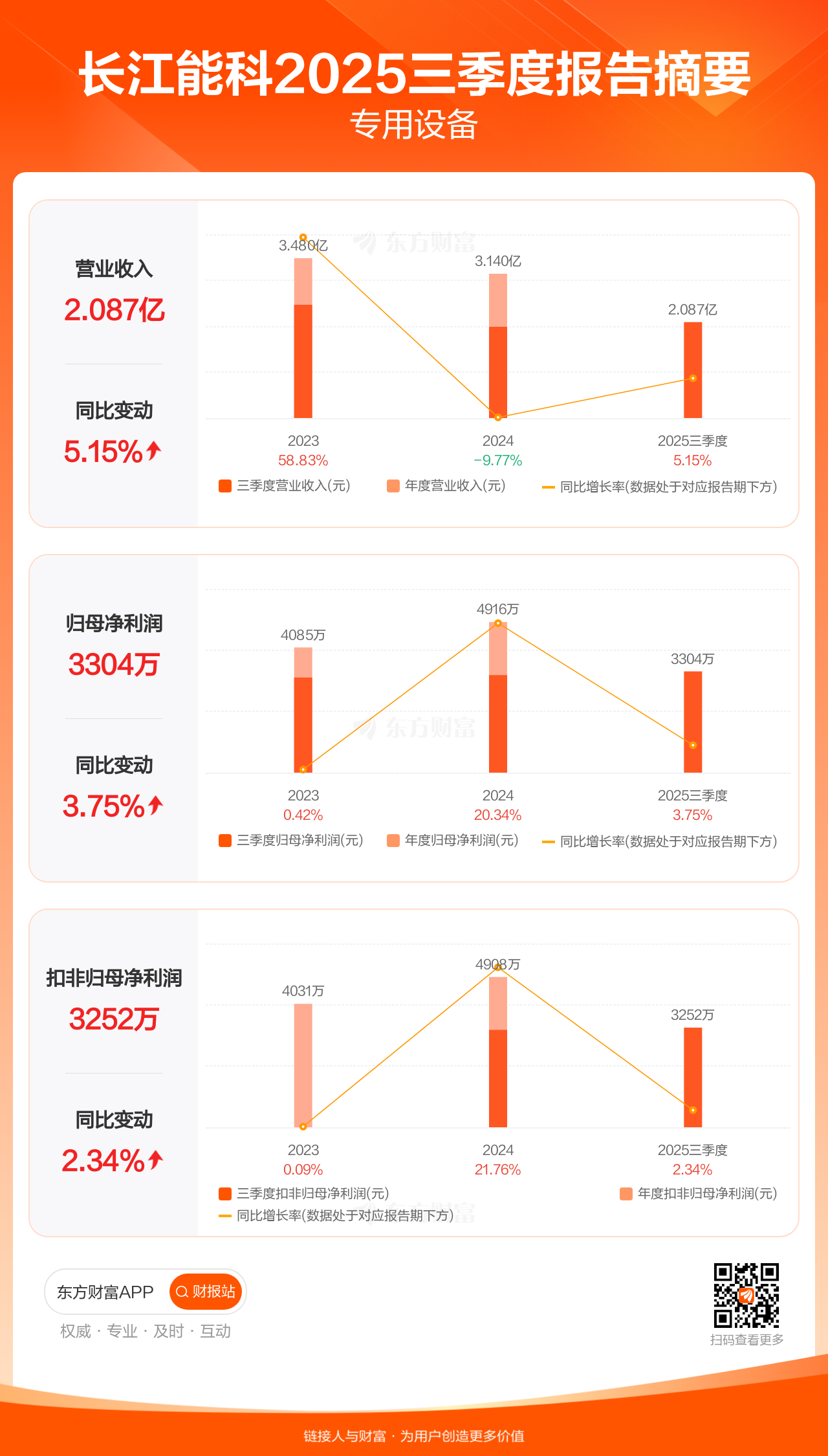 长江能科10月29日发布2025年三季报显示,公司前三季实现营业收入2.09亿元,同比增长5.15%;归母净利润3304.11万元,同比增长3.75%;扣非归母净利润3252.18万元,同比增长2.34%。