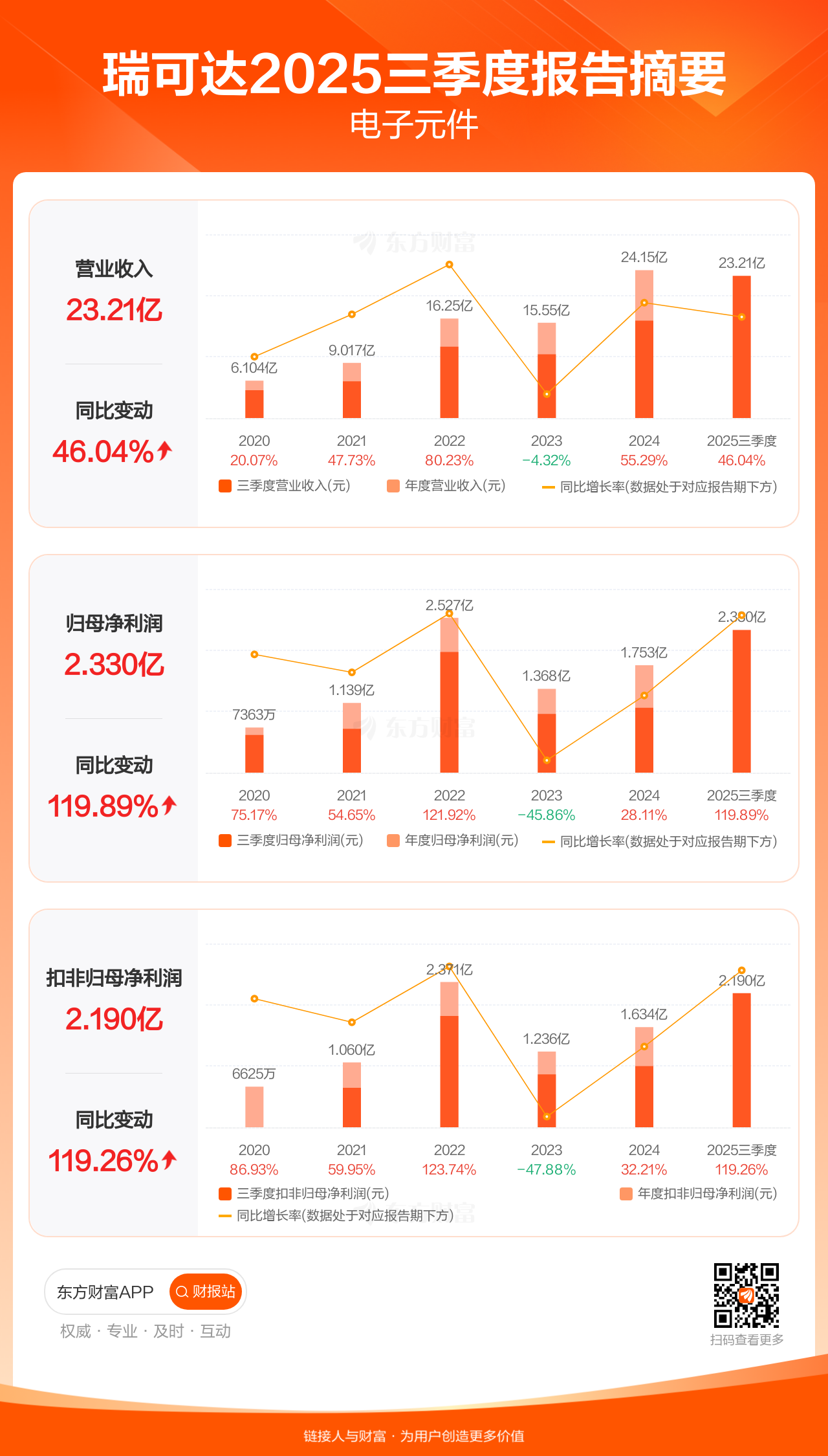 瑞可达10月30日发布2025年三季报显示,公司前三季实现营业收入23.21亿元,同比增长46.04%;归母净利润2.33亿元,同比增长119.89%;扣非归母净利润2.19亿元,同比增长119.26%。