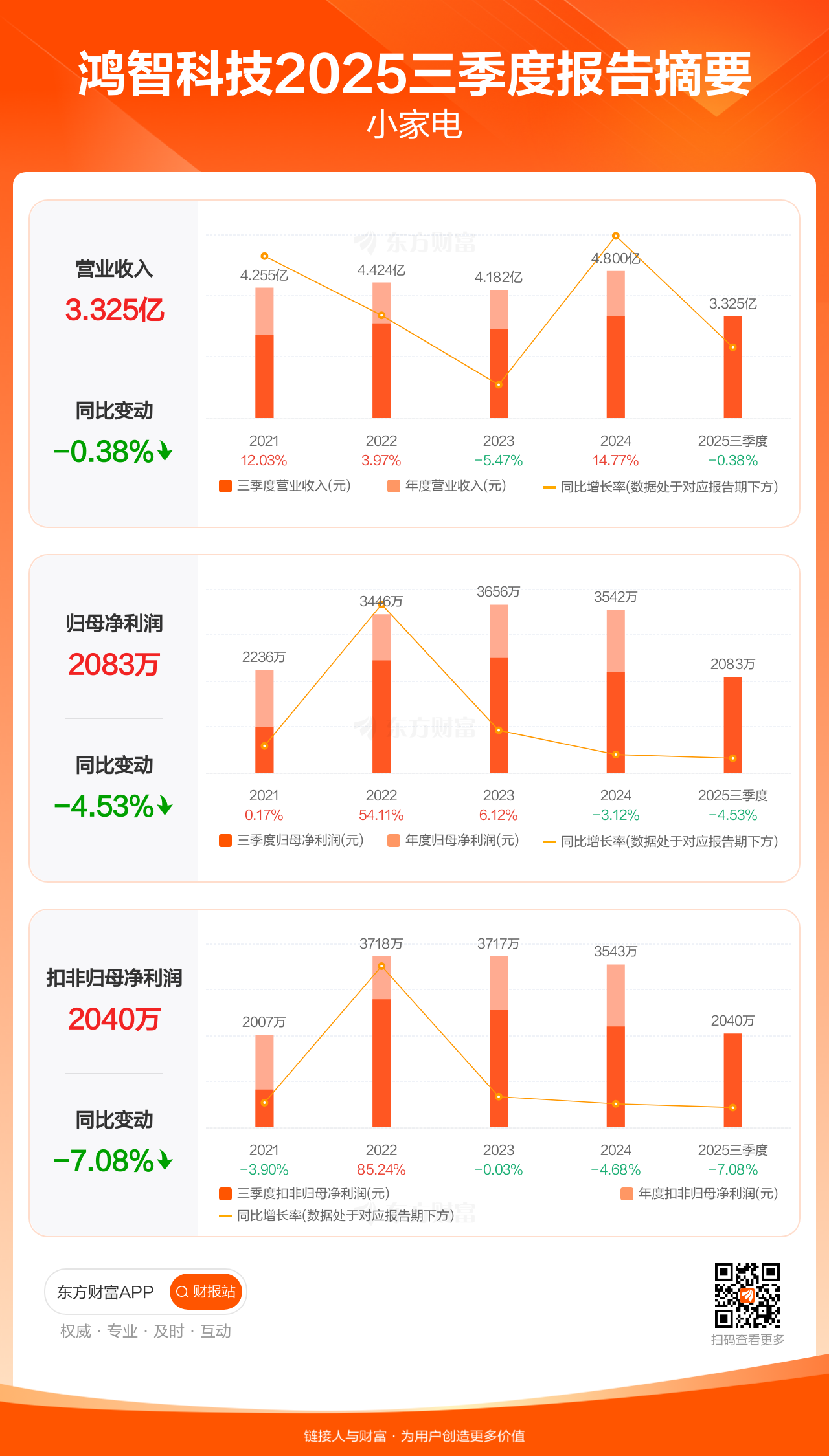 图解财报:鸿智科技前三季归母净利润2083.16万元,同比减少4.53%
