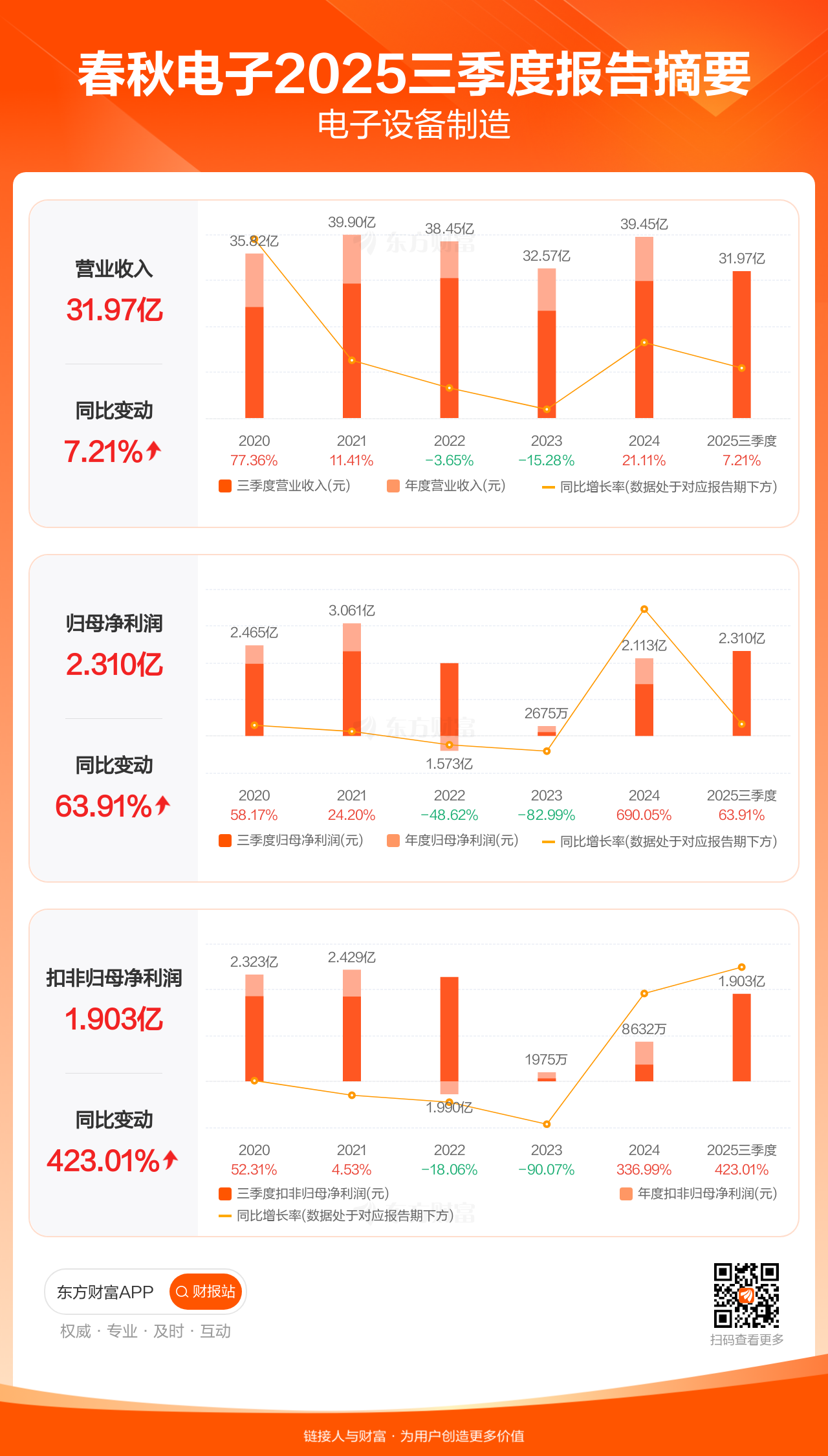 春秋电子10月30日发布2025年三季报显示,公司前三季实现营业收入31.97亿元,同比增长7.21%;归母净利润2.31亿元,同比增长63.91%;扣非归母净利润1.90亿元,同比增长423.01%。