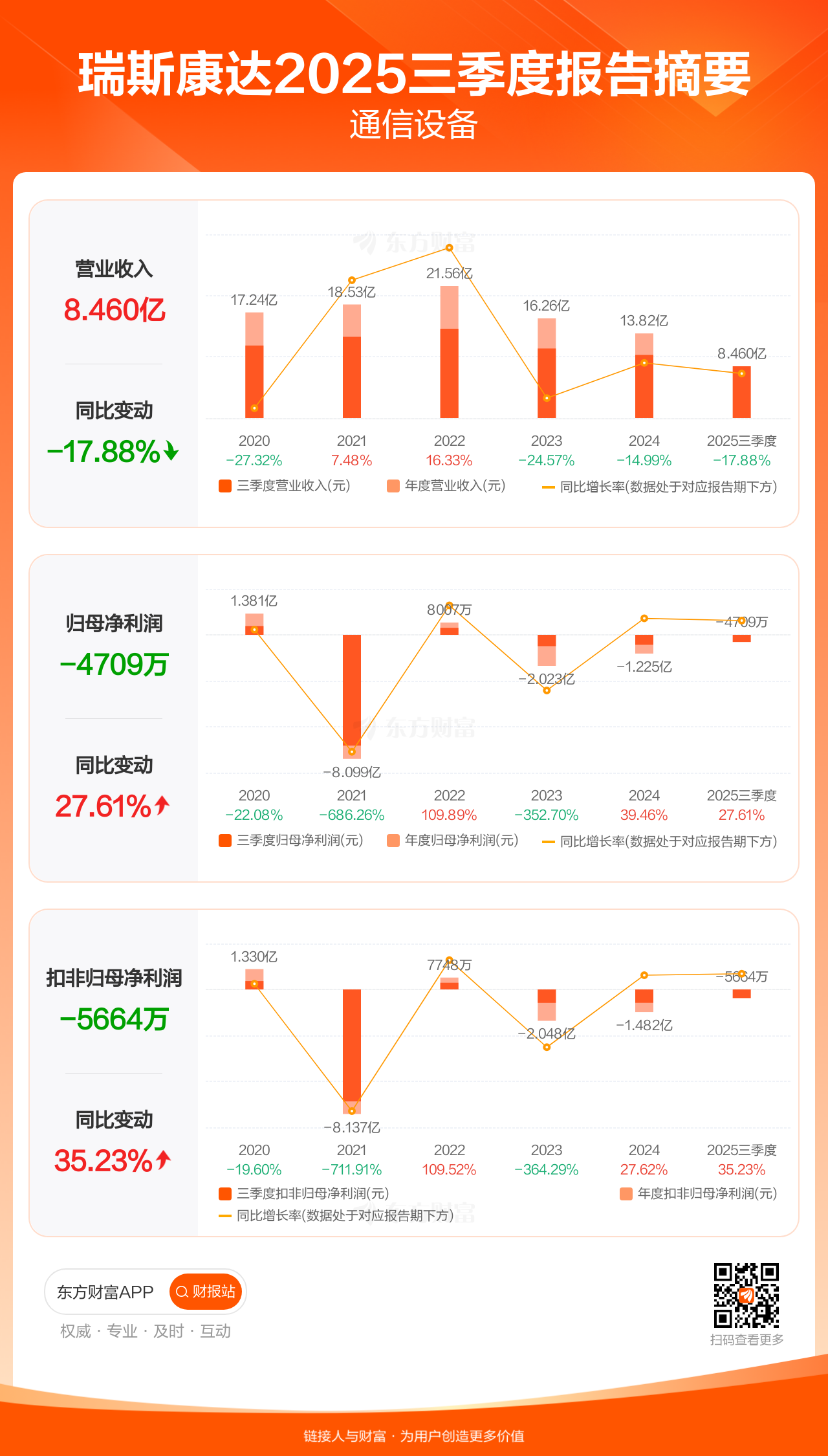瑞斯康达10月30日发布2025年三季报显示,公司前三季实现营业收入8.46亿元,同比下滑17.88%;归母净利润-4708.52万元;扣非归母净利润-5663.83万元。