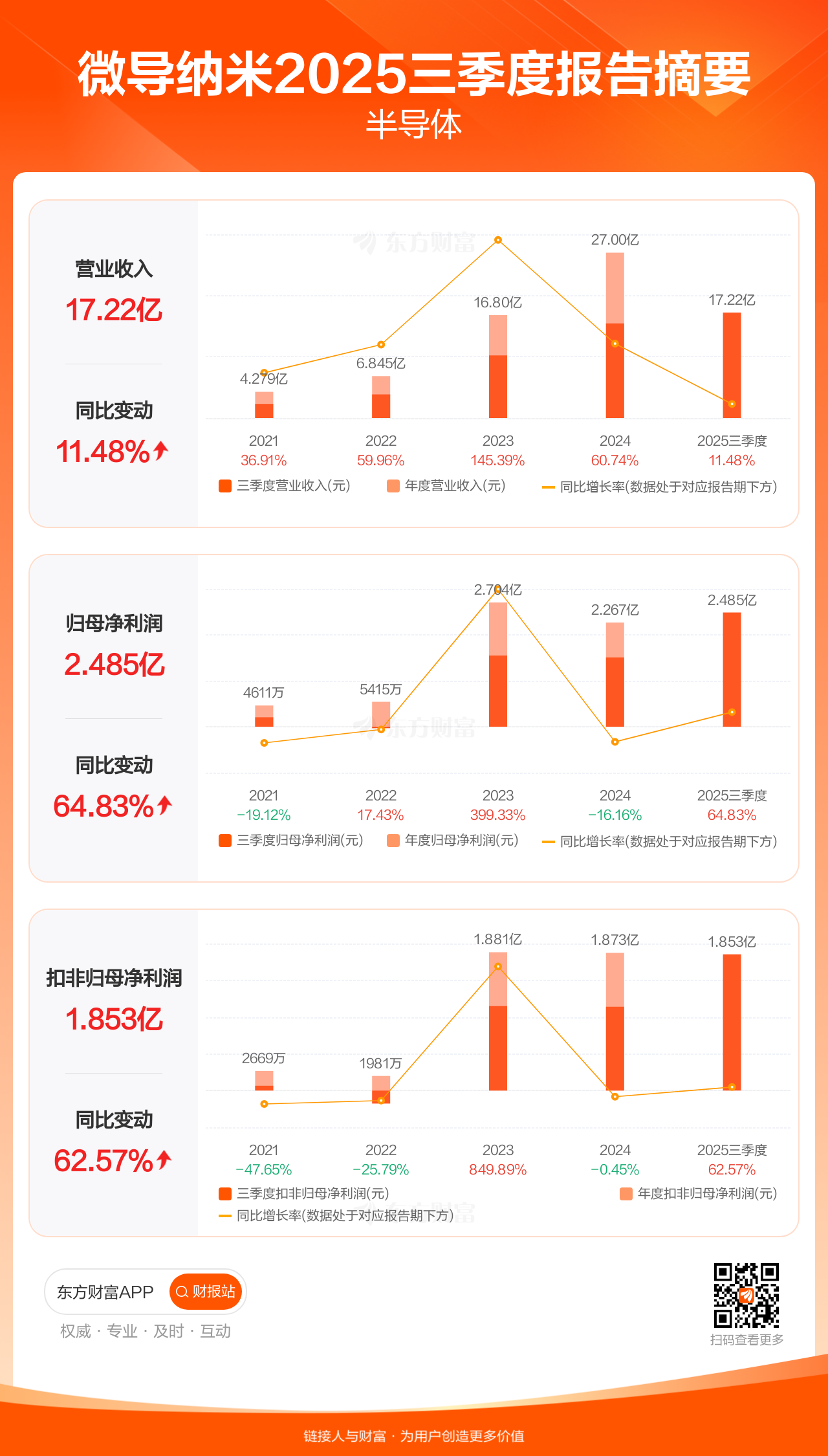 微导纳米10月30日发布2025年三季报显示,公司前三季实现营业收入17.22亿元,同比增长11.48%;归母净利润2.48亿元,同比增长64.83%;扣非归母净利润1.85亿元,同比增长62.57%。
