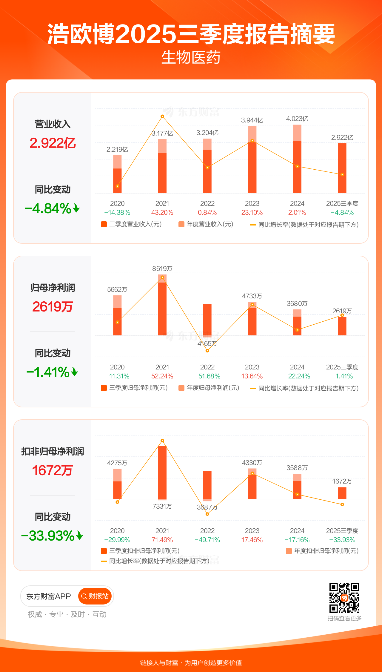 浩欧博10月30日发布2025年三季报显示,公司前三季实现营业收入2.92亿元,同比下滑4.84%;归母净利润2618.92万元,同比下滑1.41%;扣非归母净利润1672.30万元,同比下滑33.93%。