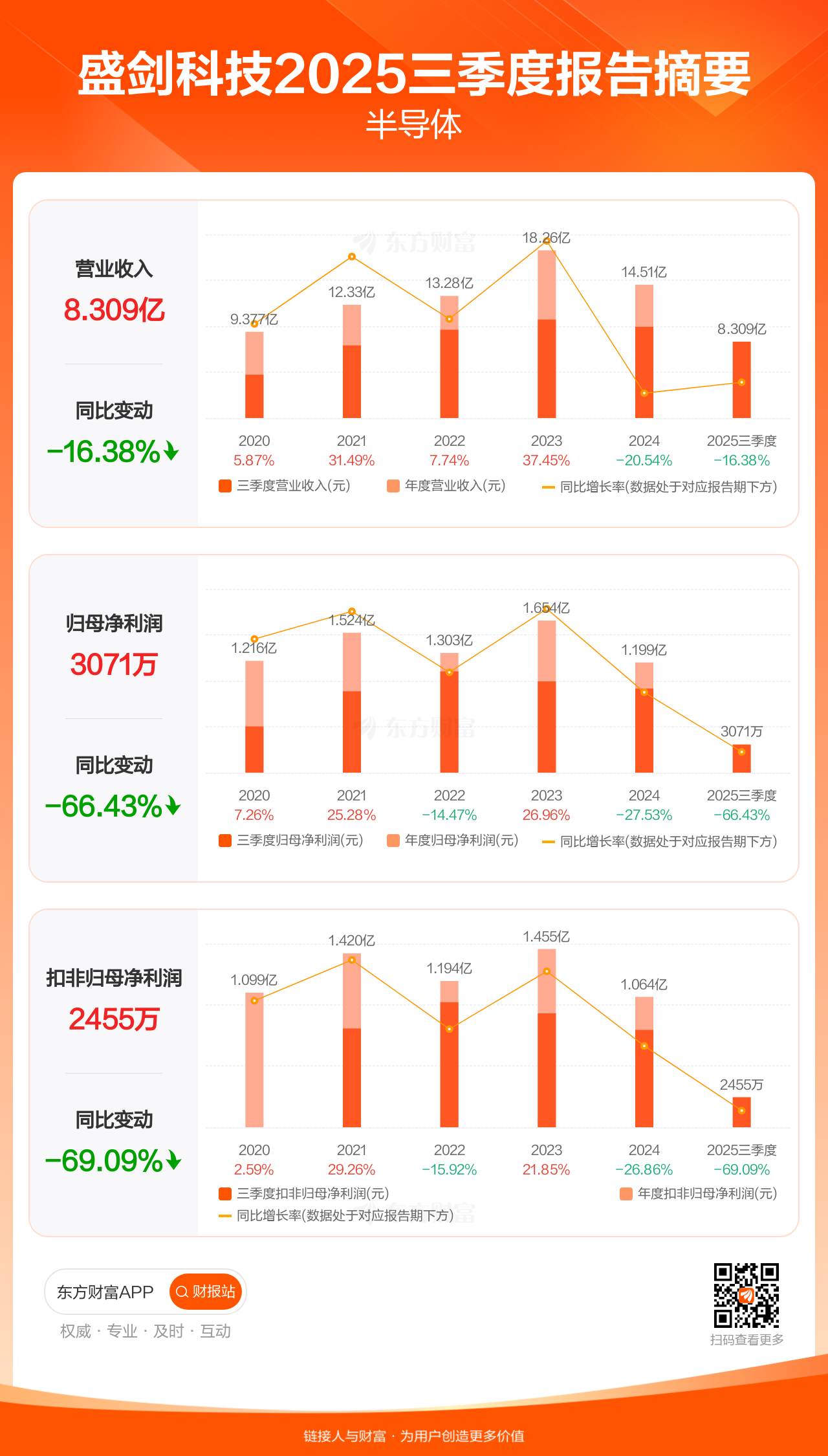 盛剑科技10月30日发布2025年三季报显示,公司前三季实现营业收入8.31亿元,同比下滑16.38%;归母净利润3070.71万元,同比下滑66.43%;扣非归母净利润2455.42万元,同比下滑69.09%。
