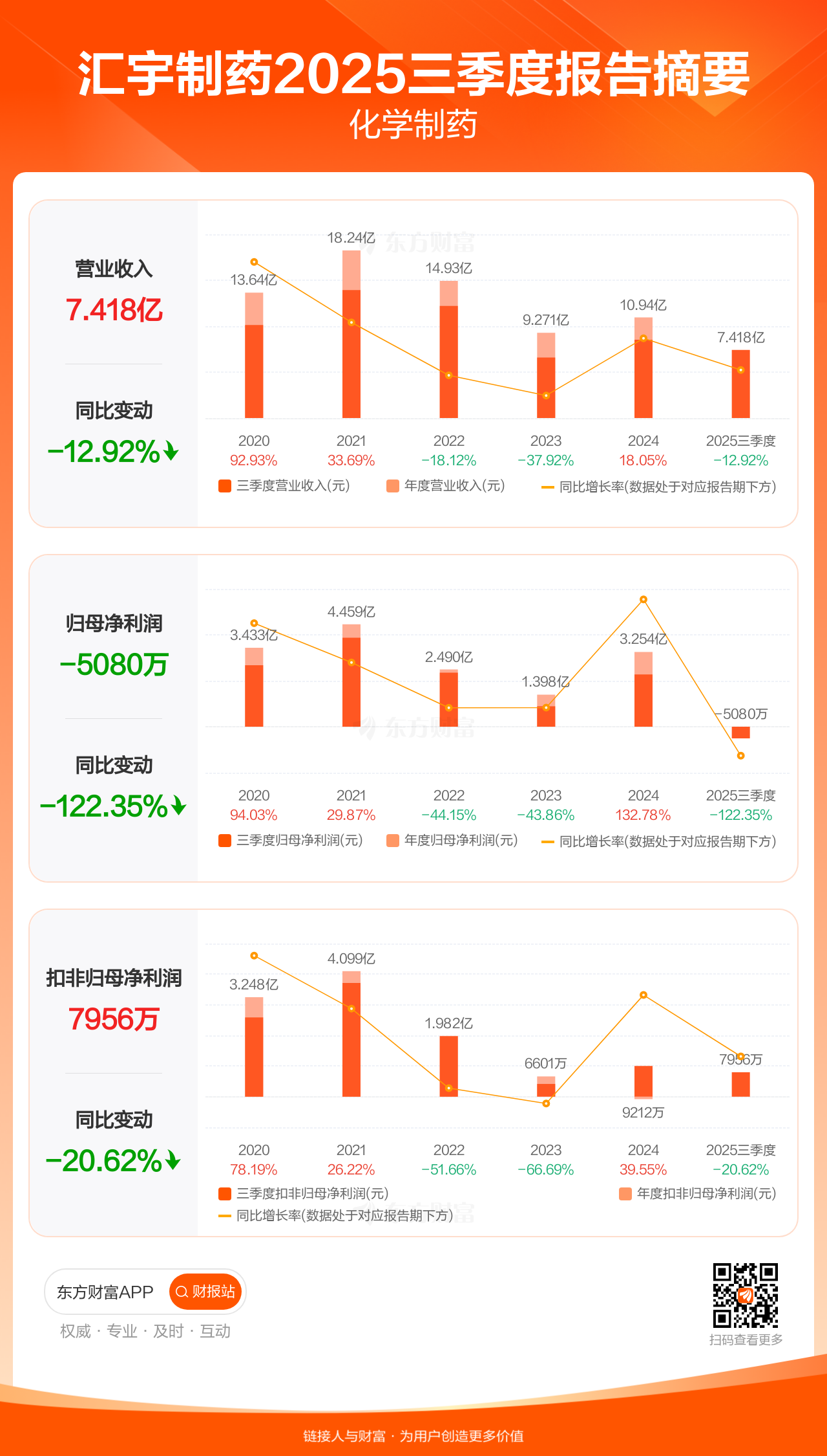 汇宇制药10月30日发布2025年三季报显示,公司前三季实现营业收入7.42亿元,同比下滑12.92%;归母净利润-5080.47万元;扣非归母净利润7956.06万元,同比下滑20.62%。