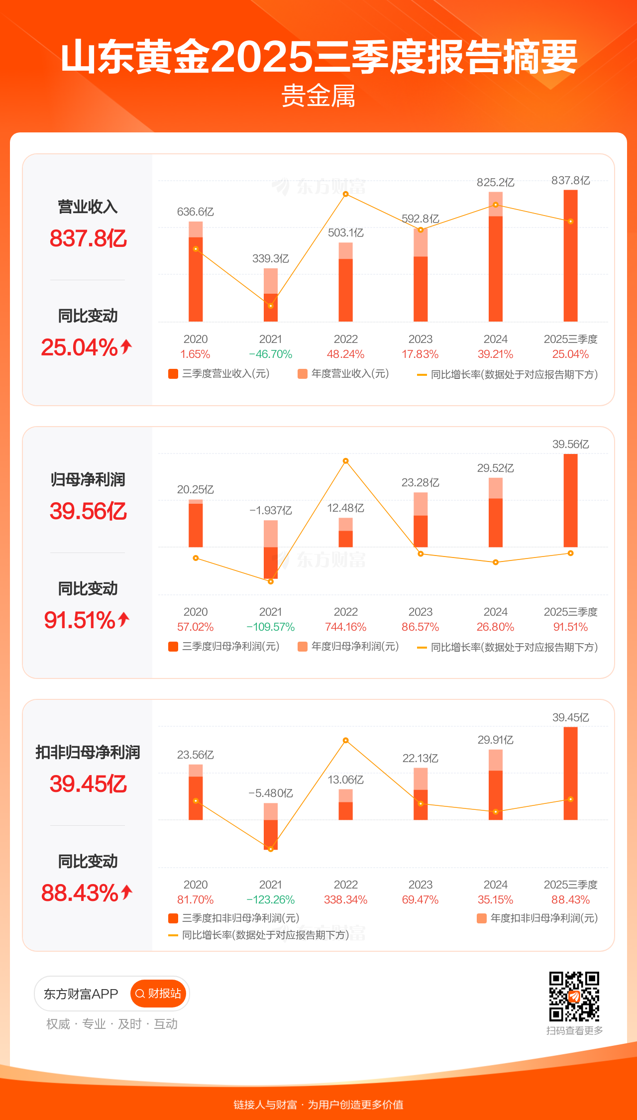 山东黄金10月30日发布2025年三季报显示,公司前三季实现营业收入837.83亿元,同比增长25.04%;归母净利润39.56亿元,同比增长91.51%;扣非归母净利润39.45亿元,同比增长88.43%