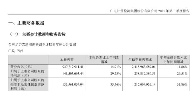 近日披露的三季度报告显示,广电计量2025前三季度营收、归母净利润均实现双位数增长。公司前三季度实现营业收入24.16亿,同比增长11.86%,第三季度实现营业收入9.37亿,同比增长14.91%;前三季度归母净利润2.38亿,同比增长26.51%,第三季度实现归母净利润1.41亿,同比增长29.73%。