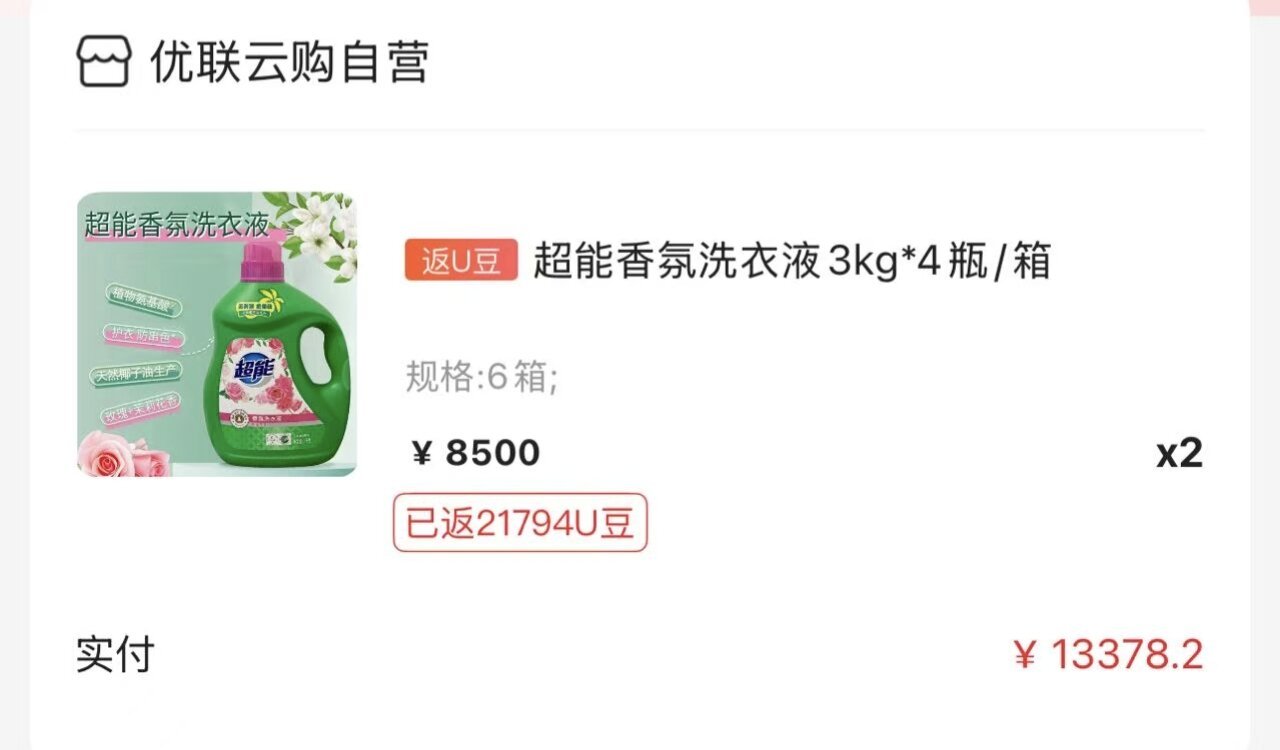 U豆是在优联云购上买黄金的必需物,商城2024年下半年推出返豆的“地方补贴”产品以来,购买“补贴产品”是消费者获取U豆的主要途径。