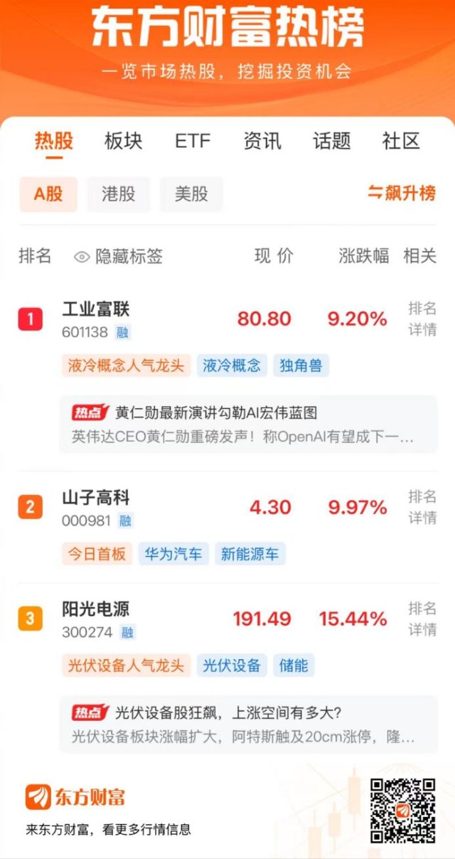 10月29日,两市震荡走高,创业板指领涨。东方财富热股榜前三的股票中,工业富联位列第1,山子高科位列第2,阳光电源位列第3。