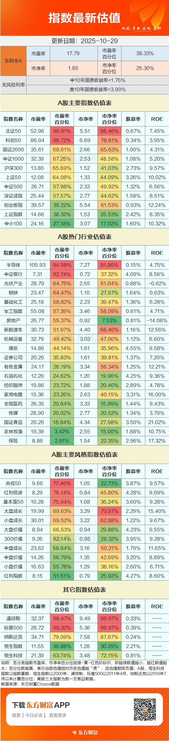 A股最新估值表(2025年10月29日)
