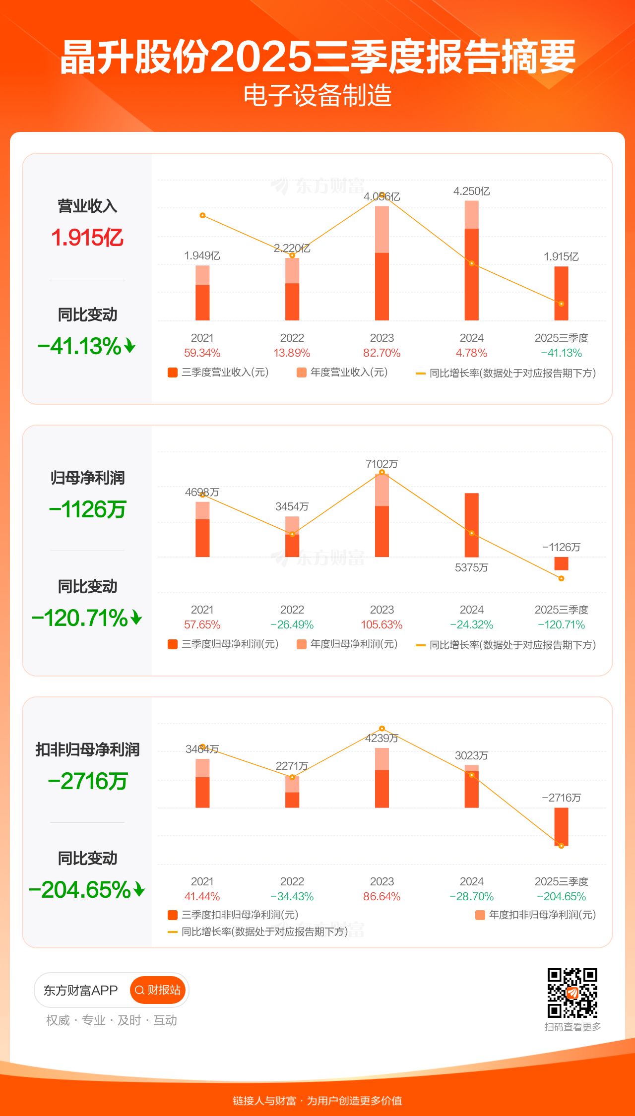 晶升股份10月30日发布2025年三季报显示,公司前三季实现营业收入1.91亿元,同比下滑41.13%;归母净利润-1126.07万元;扣非归母净利润-2716.13万元。