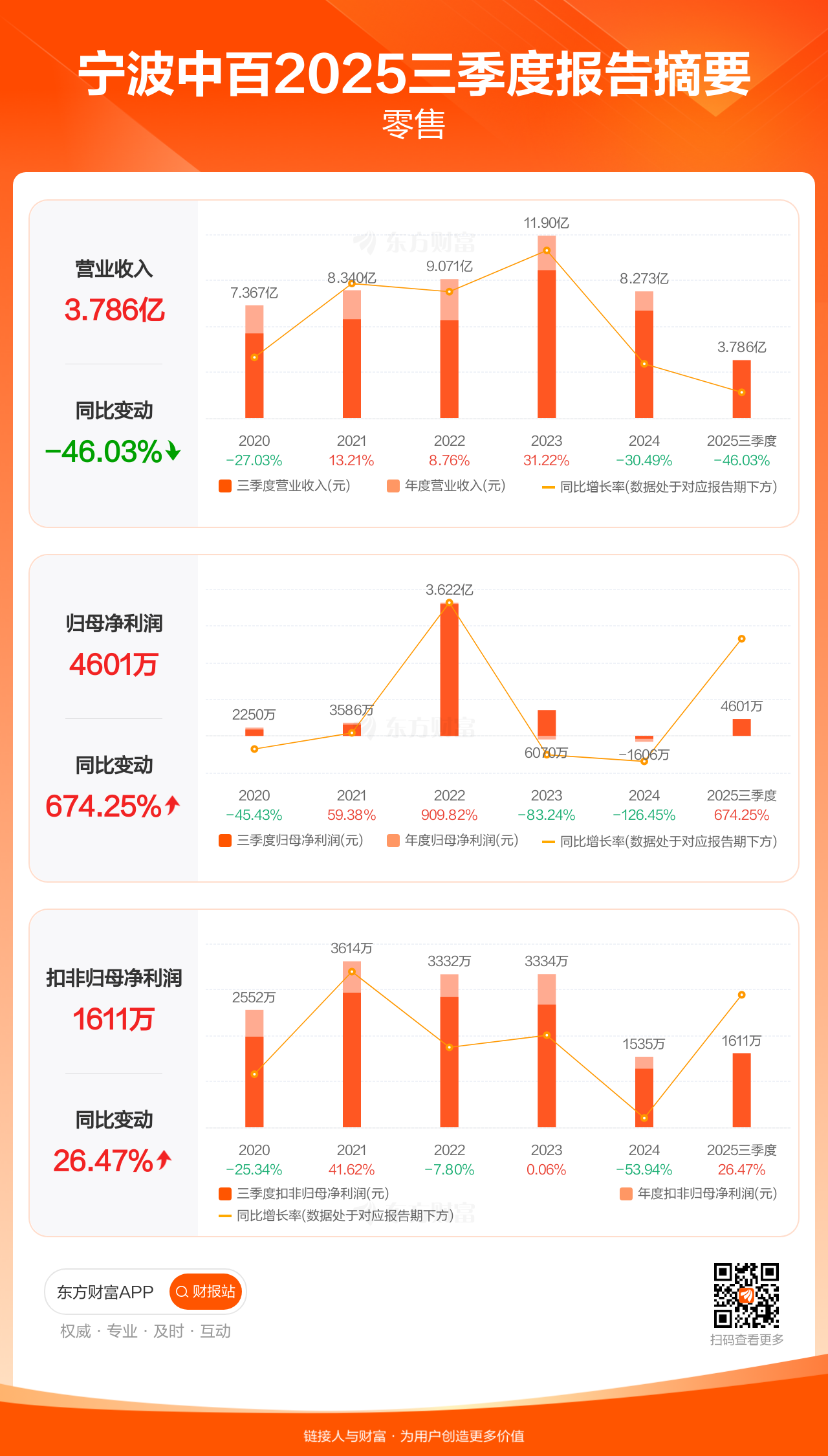 宁波中百10月30日发布2025年三季报显示,公司前三季实现营业收入3.79亿元,同比下滑46.03%;归母净利润4601.16万元,同比增长674.25%;扣非归母净利润1611.44万元,同比增长26.47%。