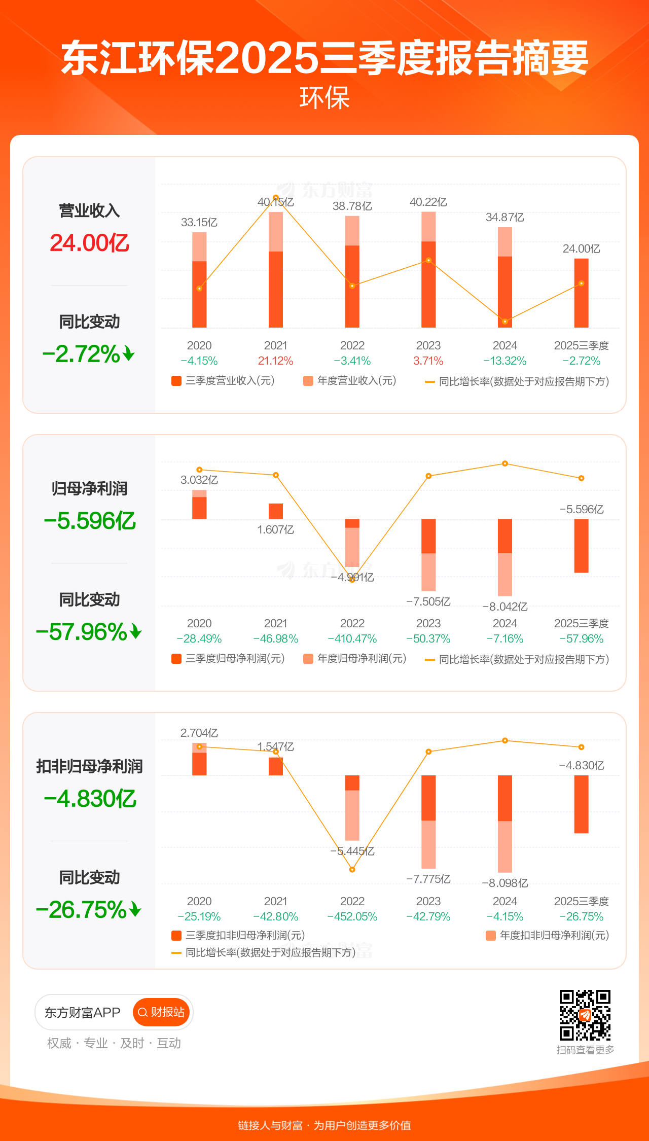东江环保10月30日发布2025年三季报显示,公司前三季实现营业收入24.00亿元,同比下滑2.72%;归母净利润-5.60亿元;扣非归母净利润-4.83亿元。