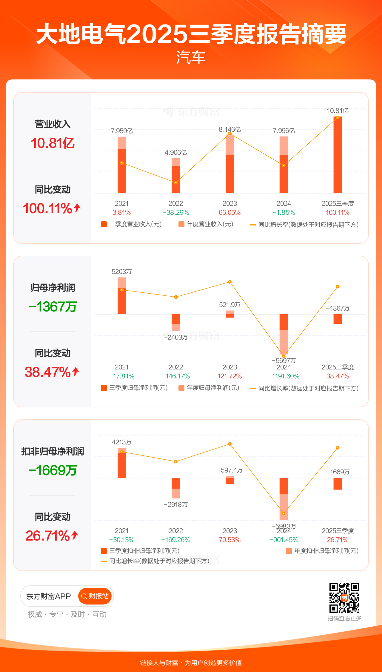 大地电气10月29日发布2025年三季报显示,公司前三季实现营业收入10.81亿元,同比增长100.11%;归母净利润-1367.17万元;扣非归母净利润-1669.31万元。