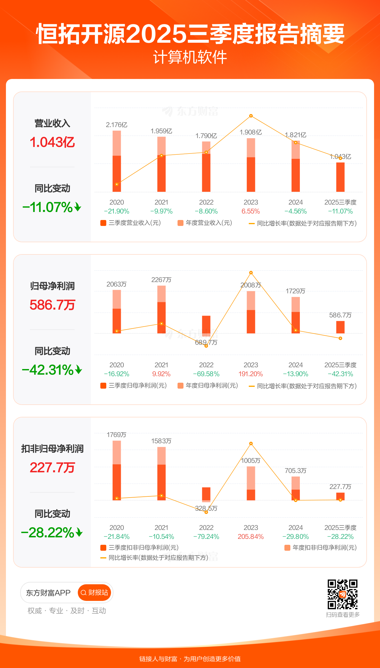 恒拓开源10月29日发布2025年三季报显示,公司前三季实现营业收入1.04亿元,同比下滑11.07%;归母净利润586.66万元,同比下滑42.31%;扣非归母净利润227.71万元,同比下滑28.22%。