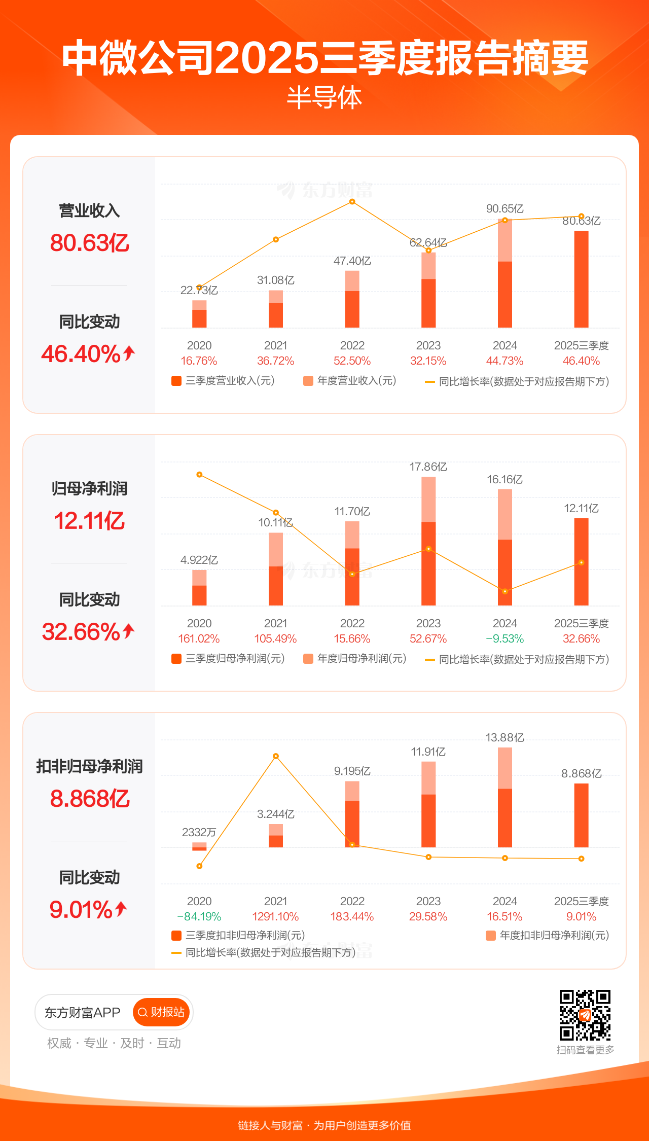 中微公司10月30日发布2025年三季报显示,公司前三季实现营业收入80.63亿元,同比增长46.40%;归母净利润12.11亿元,同比增长32.66%;扣非归母净利润8.87亿元,同比增长9.01%。