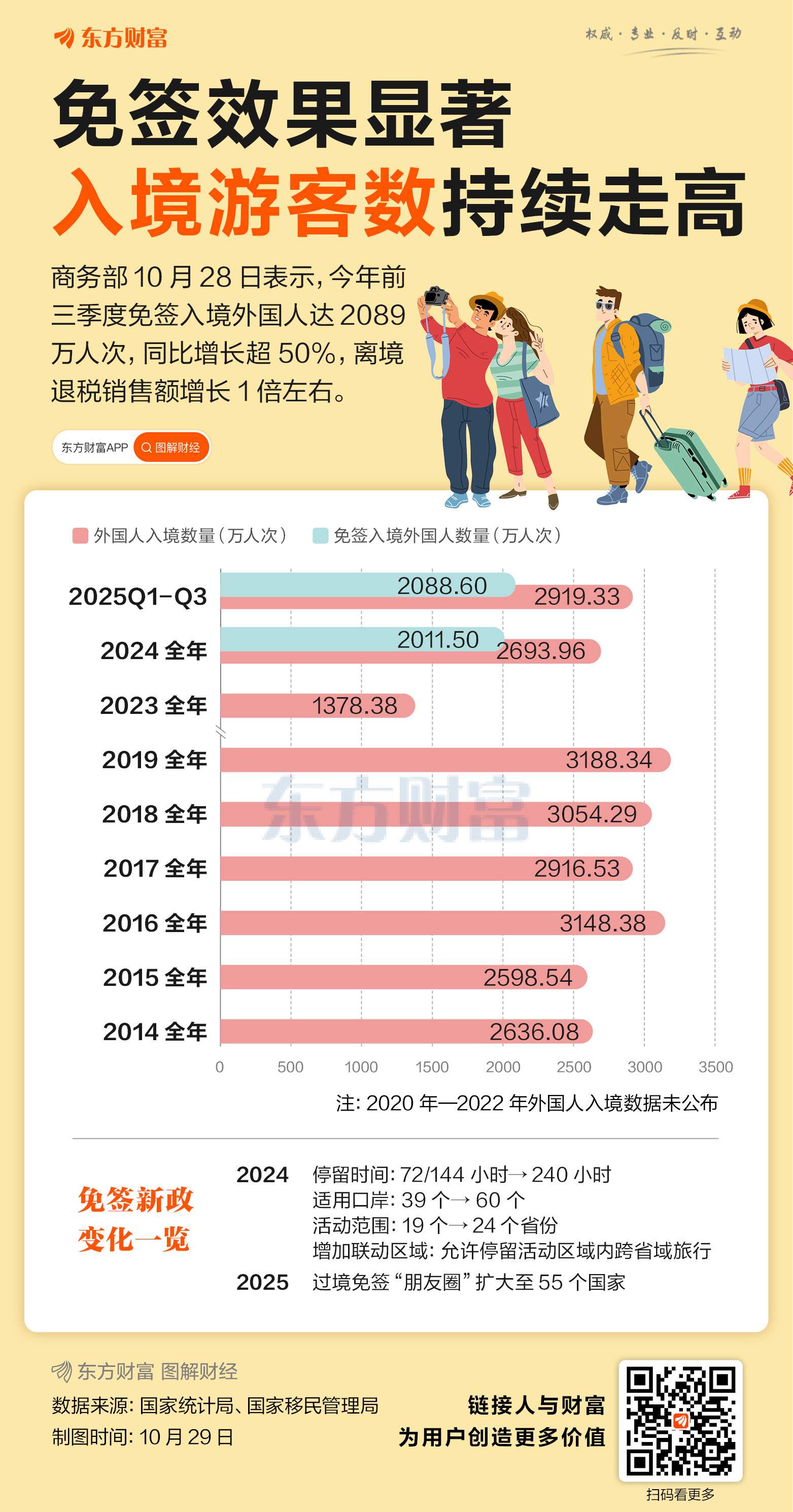 同时,根据国家统计局和国家移民管理局数据,今年前三季度入境外国人为2919.33万人次,已超去年全年,其中71.6%为免签入境。