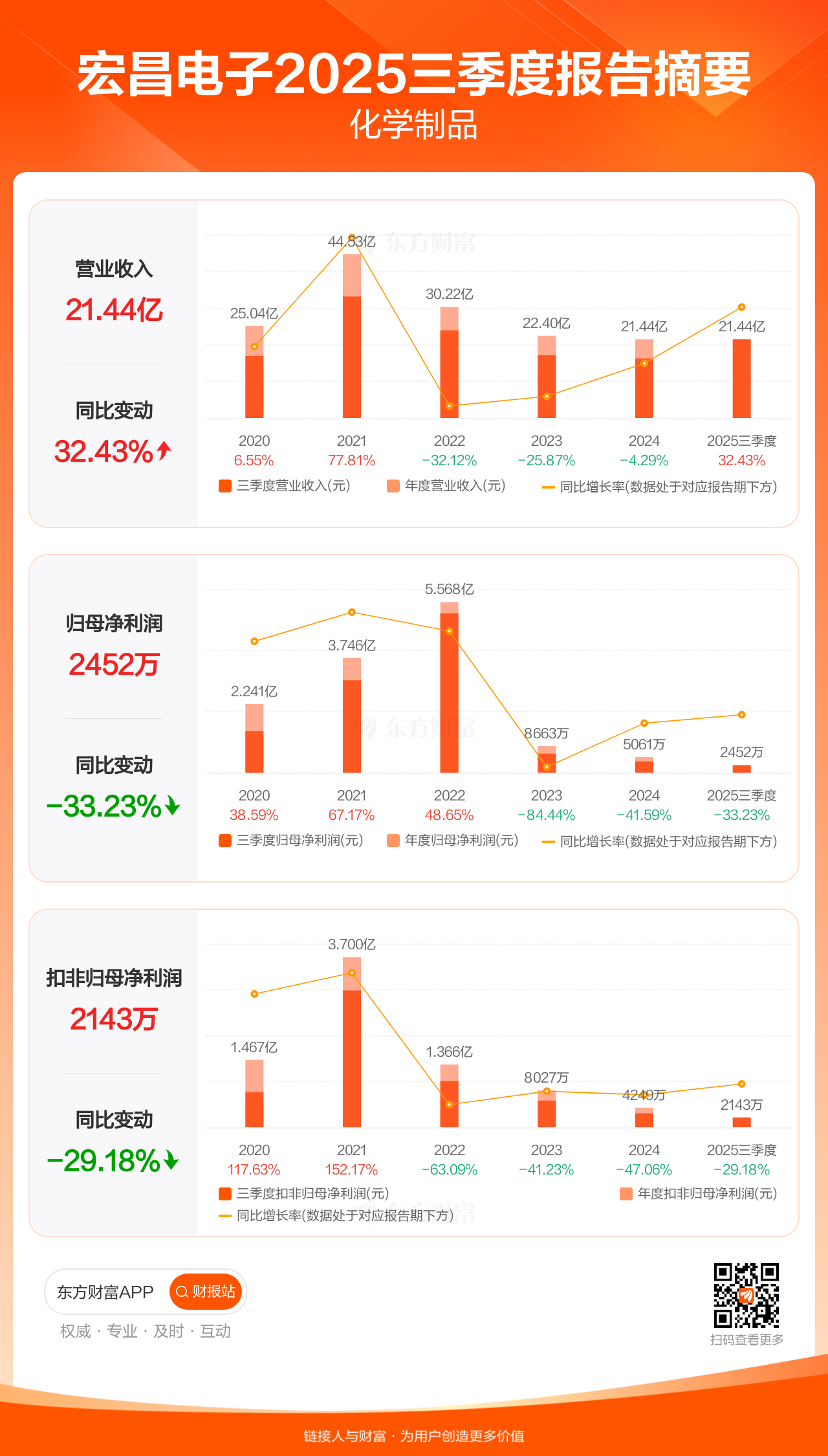 宏昌电子10月30日发布2025年三季报显示,公司前三季实现营业收入21.44亿元,同比增长32.43%;归母净利润2451.55万元,同比下滑33.23%;扣非归母净利润2142.83万元,同比下滑29.18%。