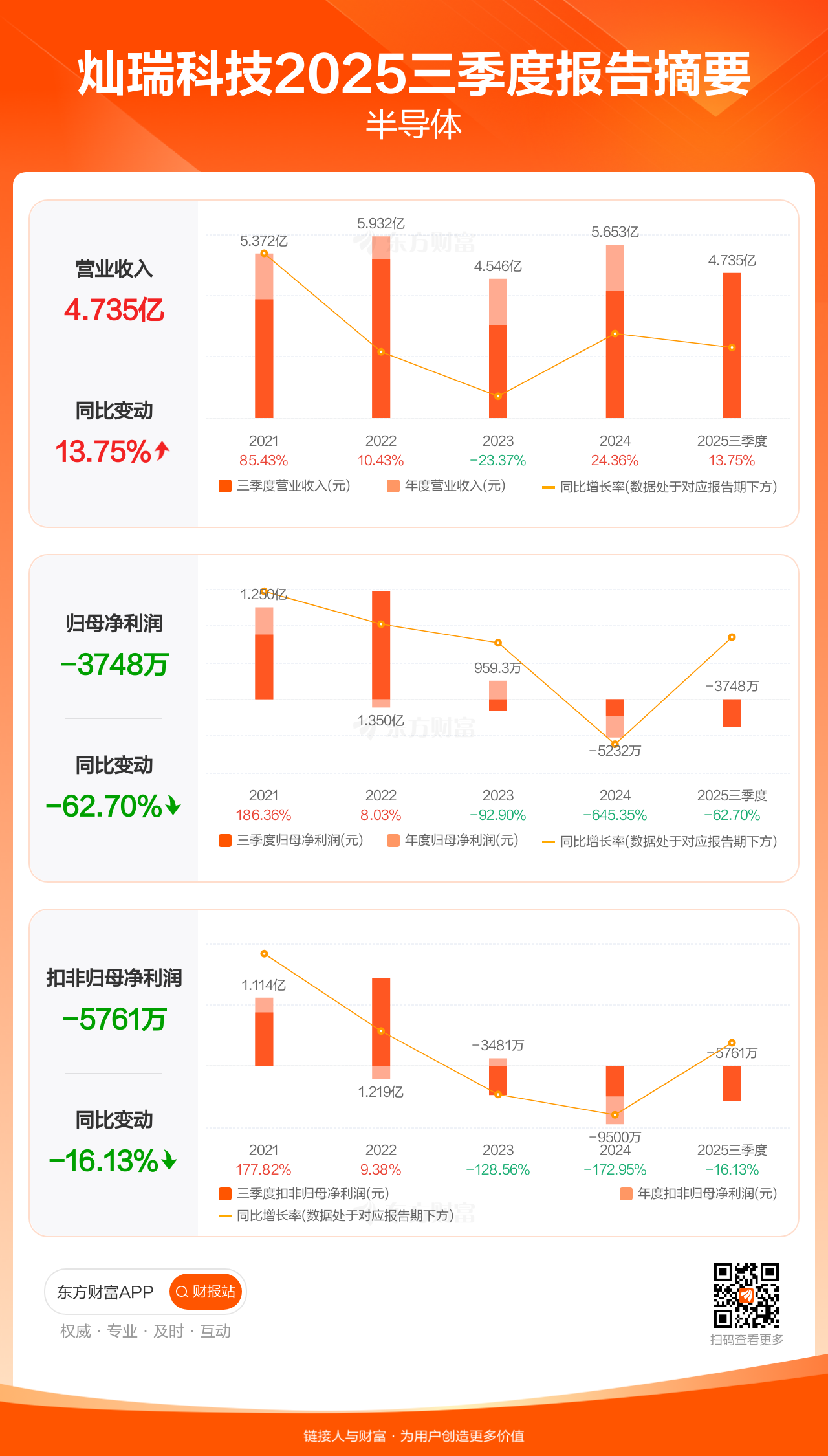 灿瑞科技10月30日发布2025年三季报显示,公司前三季实现营业收入4.74亿元,同比增长13.75%;归母净利润-3747.63万元;扣非归母净利润-5761.42万元。