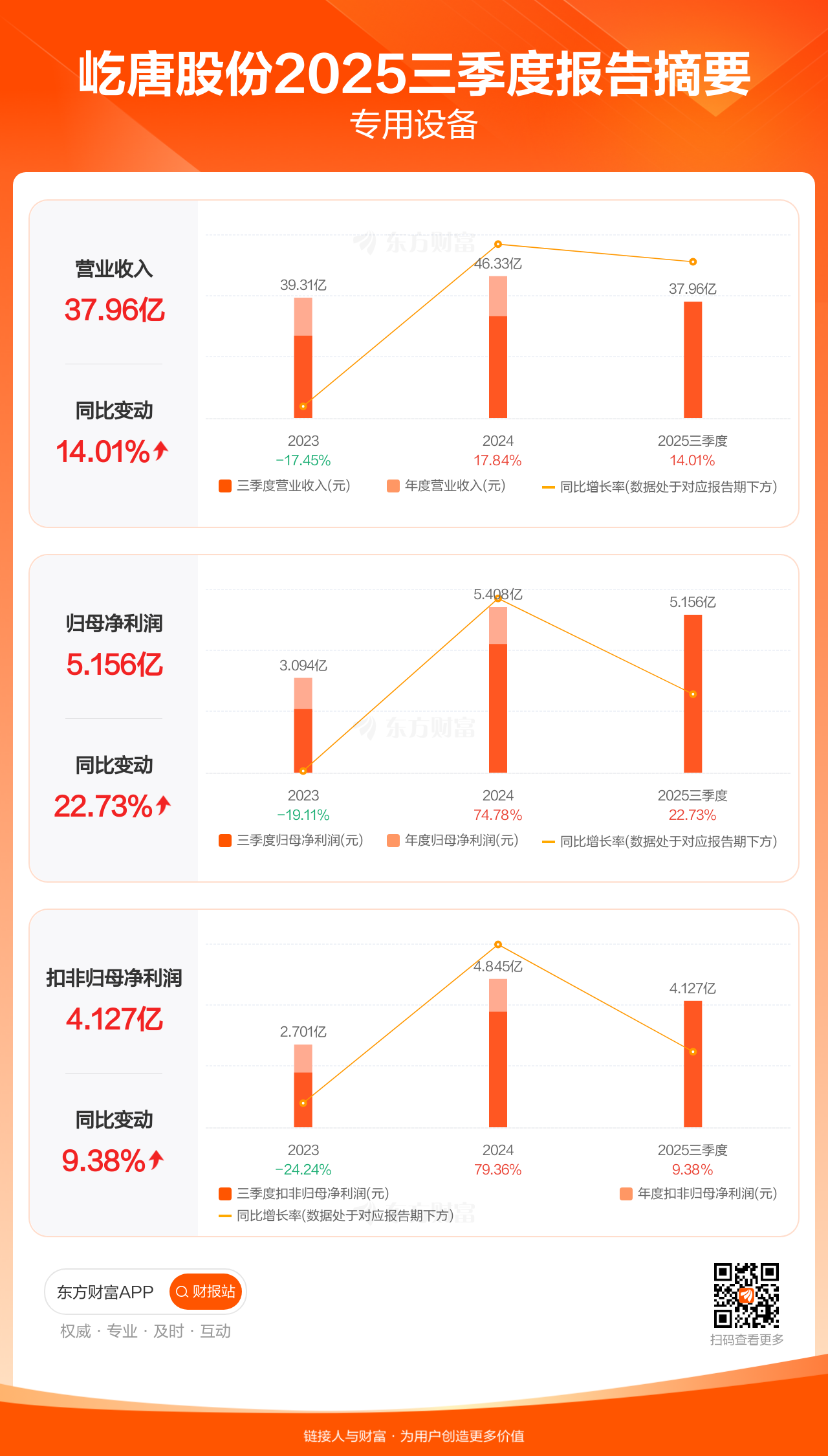 屹唐股份10月30日发布2025年三季报显示,公司前三季实现营业收入37.96亿元,同比增长14.01%;归母净利润5.16亿元,同比增长22.73%;扣非归母净利润4.13亿元,同比增长9.38%。