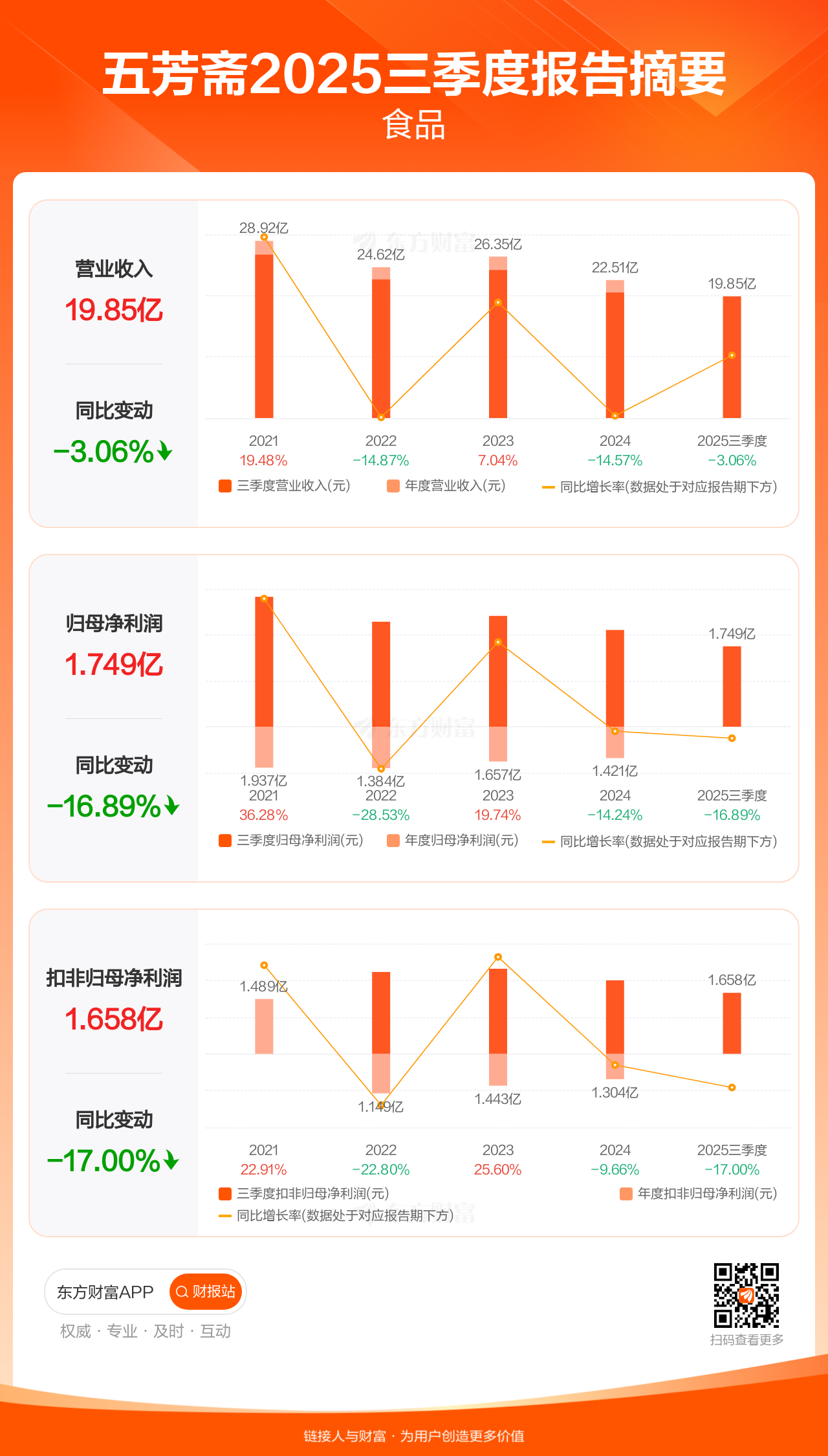 五芳斋10月30日发布2025年三季报显示,公司前三季实现营业收入19.85亿元,同比下滑3.06%;归母净利润1.75亿元,同比下滑16.89%;扣非归母净利润1.66亿元,同比下滑17.00%。