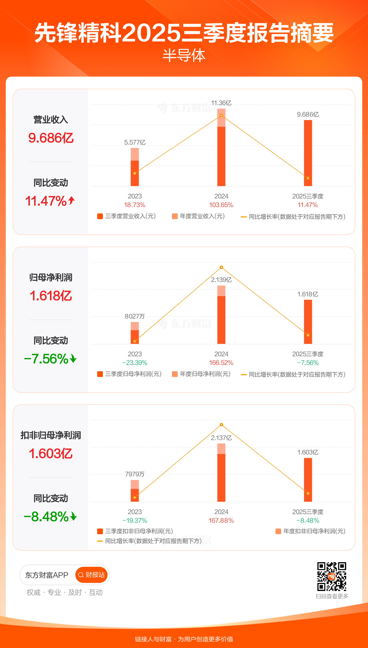 先锋精科10月30日发布2025年三季报显示,公司前三季实现营业收入9.69亿元,同比增长11.47%;归母净利润1.62亿元,同比下滑7.56%;扣非归母净利润1.60亿元,同比下滑8.48%。