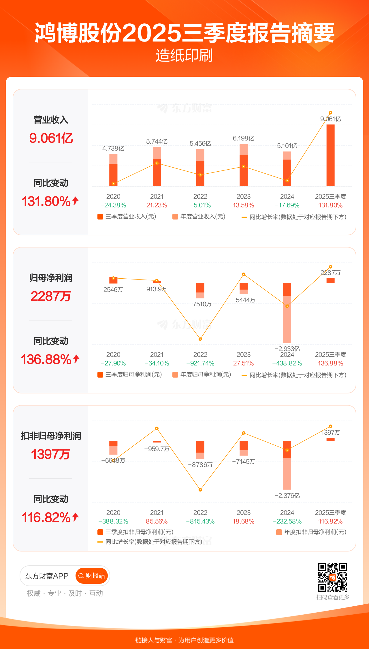 鸿博股份10月30日发布2025年三季报显示,公司前三季实现营业收入9.06亿元,同比增长131.80%;归母净利润2287.15万元,同比增长136.88%;扣非归母净利润1396.71万元,同比增长116.82%。