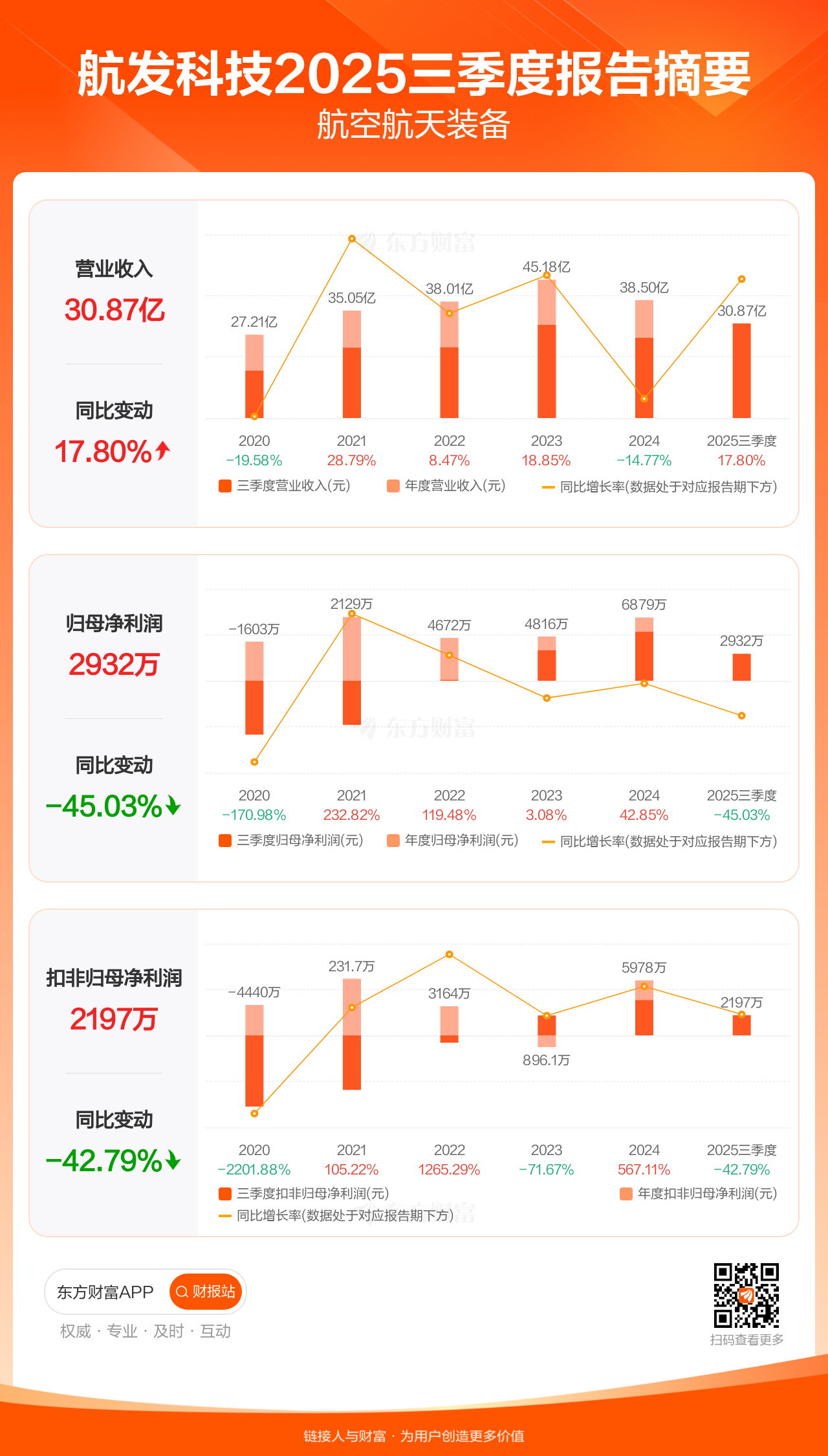 航发科技10月30日发布2025年三季报显示,公司前三季实现营业收入30.87亿元,同比增长17.80%;归母净利润2931.93万元,同比下滑45.03%;扣非归母净利润2197.30万元,同比下滑42.79%。