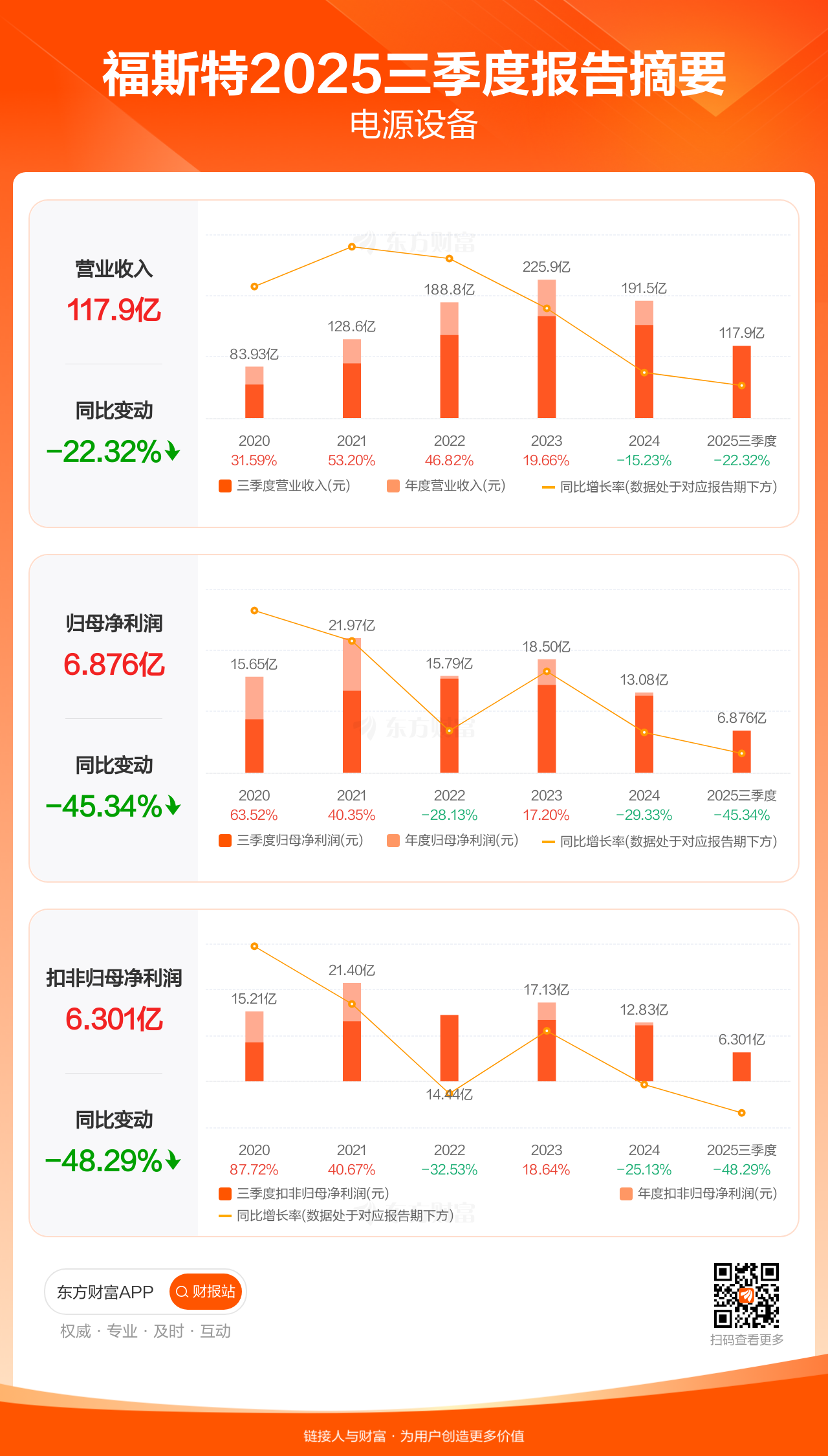 福斯特10月30日发布2025年三季报显示,公司前三季实现营业收入117.88亿元,同比下滑22.32%;归母净利润6.88亿元,同比下滑45.34%;扣非归母净利润6.30亿元,同比下滑48.29%