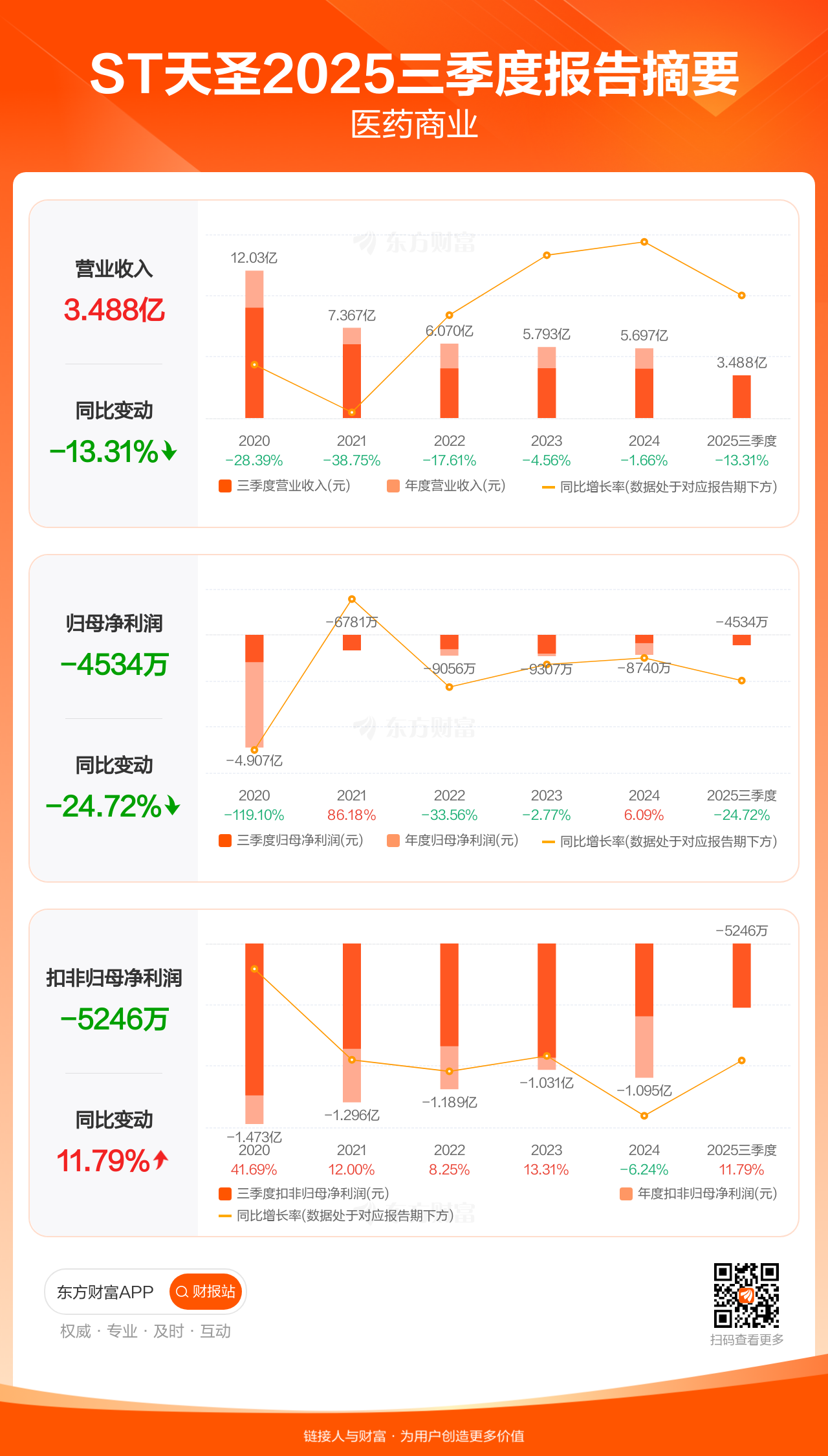 ST天圣10月30日发布2025年三季报显示,公司前三季实现营业收入3.49亿元,同比下滑13.31%;归母净利润-4533.94万元;扣非归母净利润-5245.58万元。