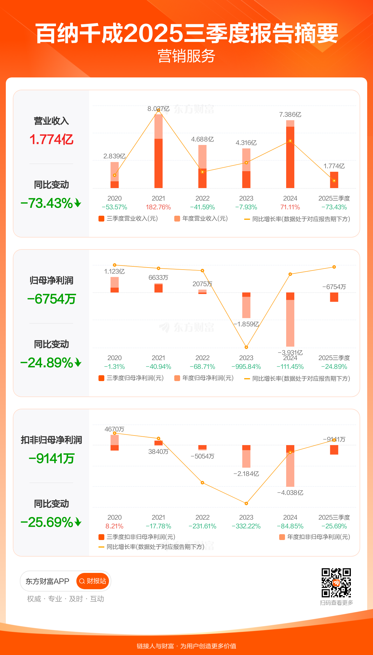 百纳千成10月30日发布2025年三季报显示,公司前三季实现营业收入1.77亿元,同比下滑73.43%;归母净利润-6753.81万元;扣非归母净利润-9141.33万元。