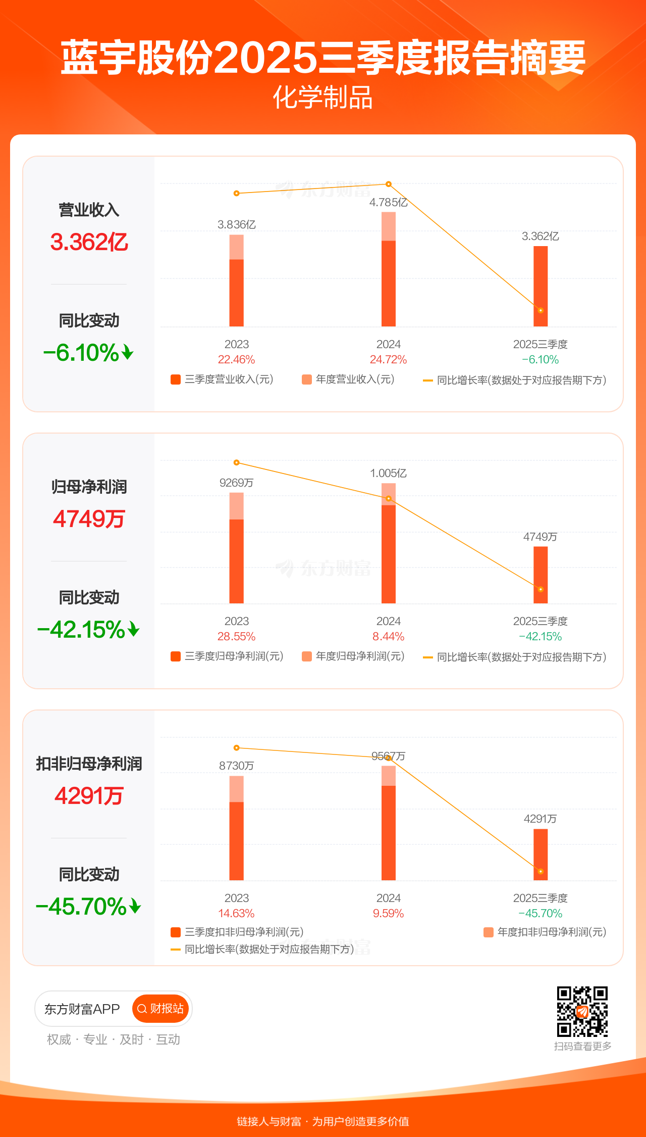 蓝宇股份10月30日发布2025年三季报显示,公司前三季实现营业收入3.36亿元,同比下滑6.10%;归母净利润4749.00万元,同比下滑42.15%;扣非归母净利润4290.87万元,同比下滑45.70%。