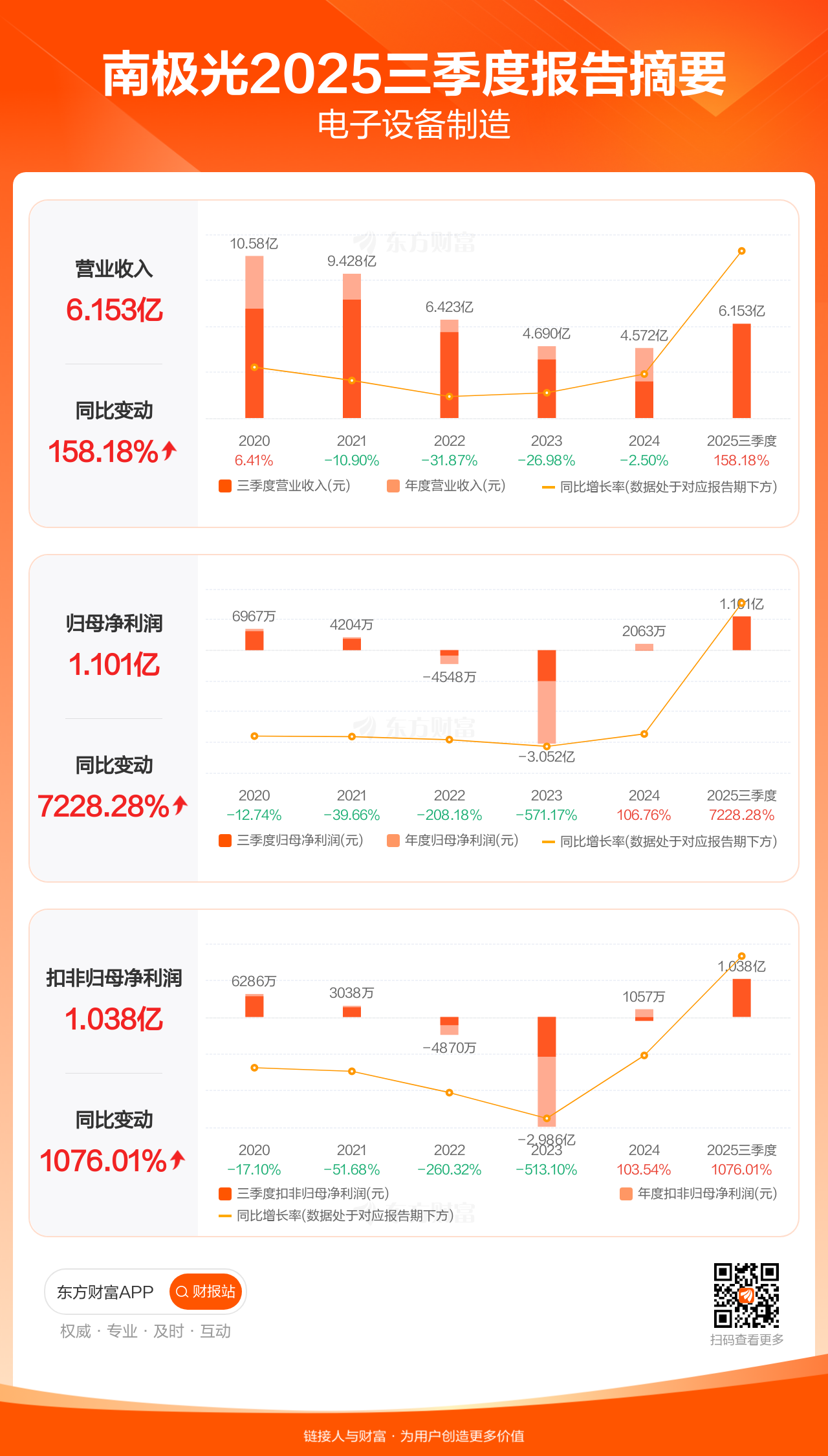 南极光10月30日发布2025年三季报显示,公司前三季实现营业收入6.15亿元,同比增长158.18%;归母净利润1.10亿元,同比增长7228.28%;扣非归母净利润1.04亿元,同比增长1076.01%。