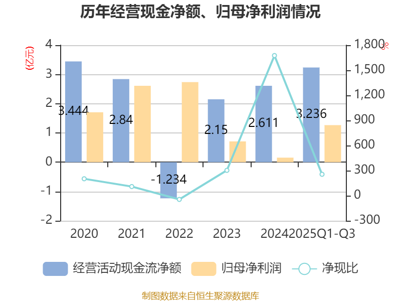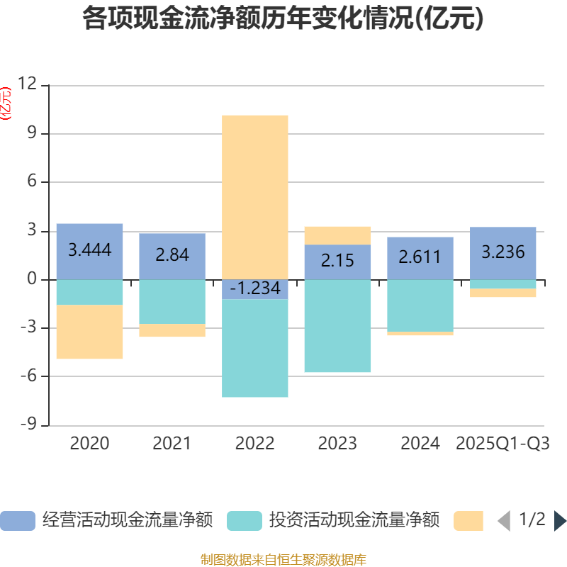 2025年前三季度,公司经营活动现金流净额为3.24亿元,同比增加3.54亿元;筹资活动现金流净额-5137.84万元,同比减少1.35亿元;投资活动现金流净额-5760.6万元,上年同期为-2.8亿元。