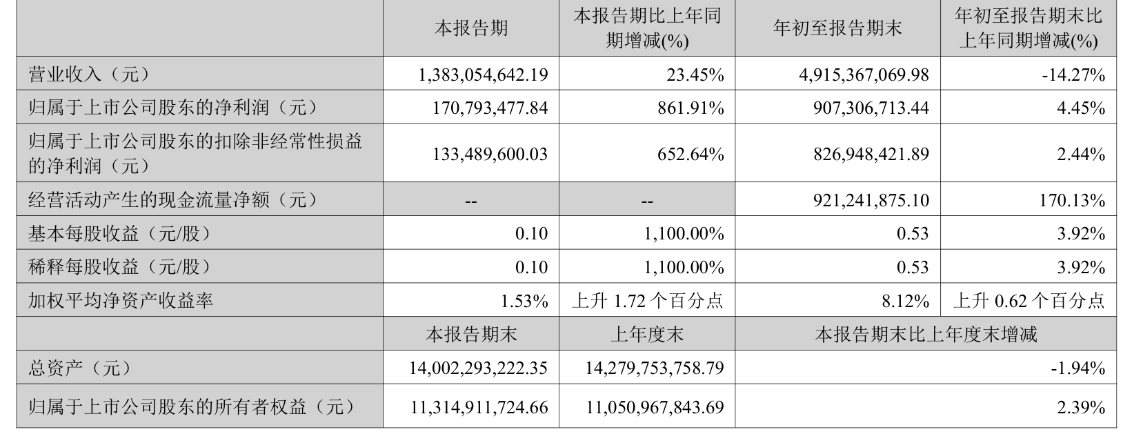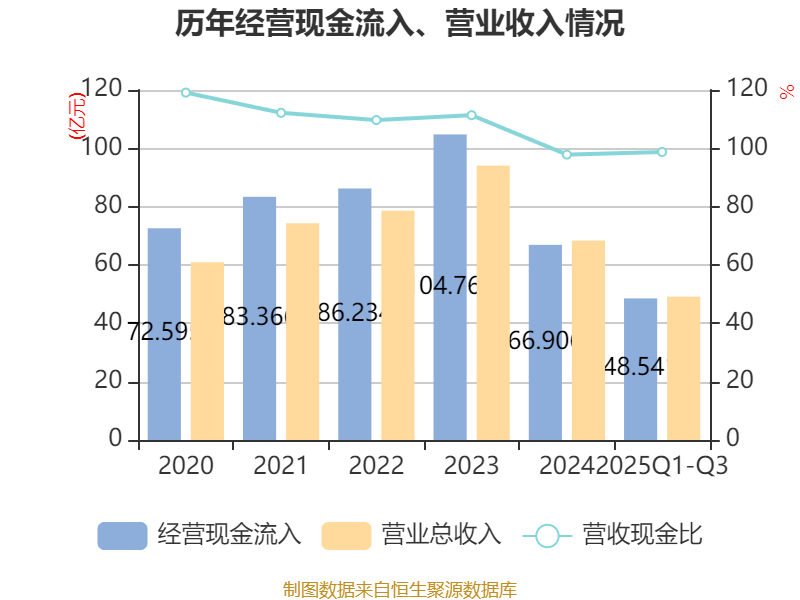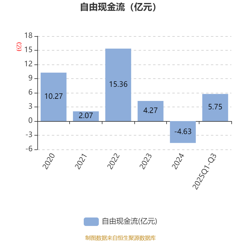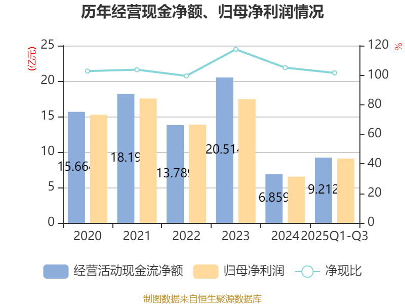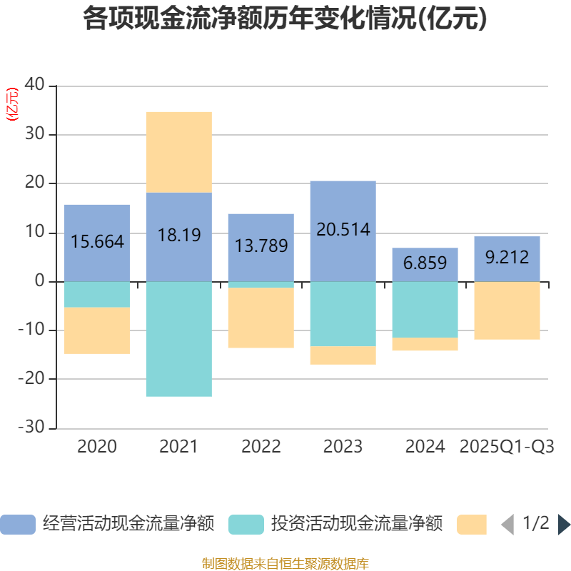 2025年前三季度,公司经营活动现金流净额为9.21亿元,同比增长170.13%;筹资活动现金流净额-11.81亿元,同比增加5746.64万元;投资活动现金流净额-578.59万元,上年同期为-4200.96万元。