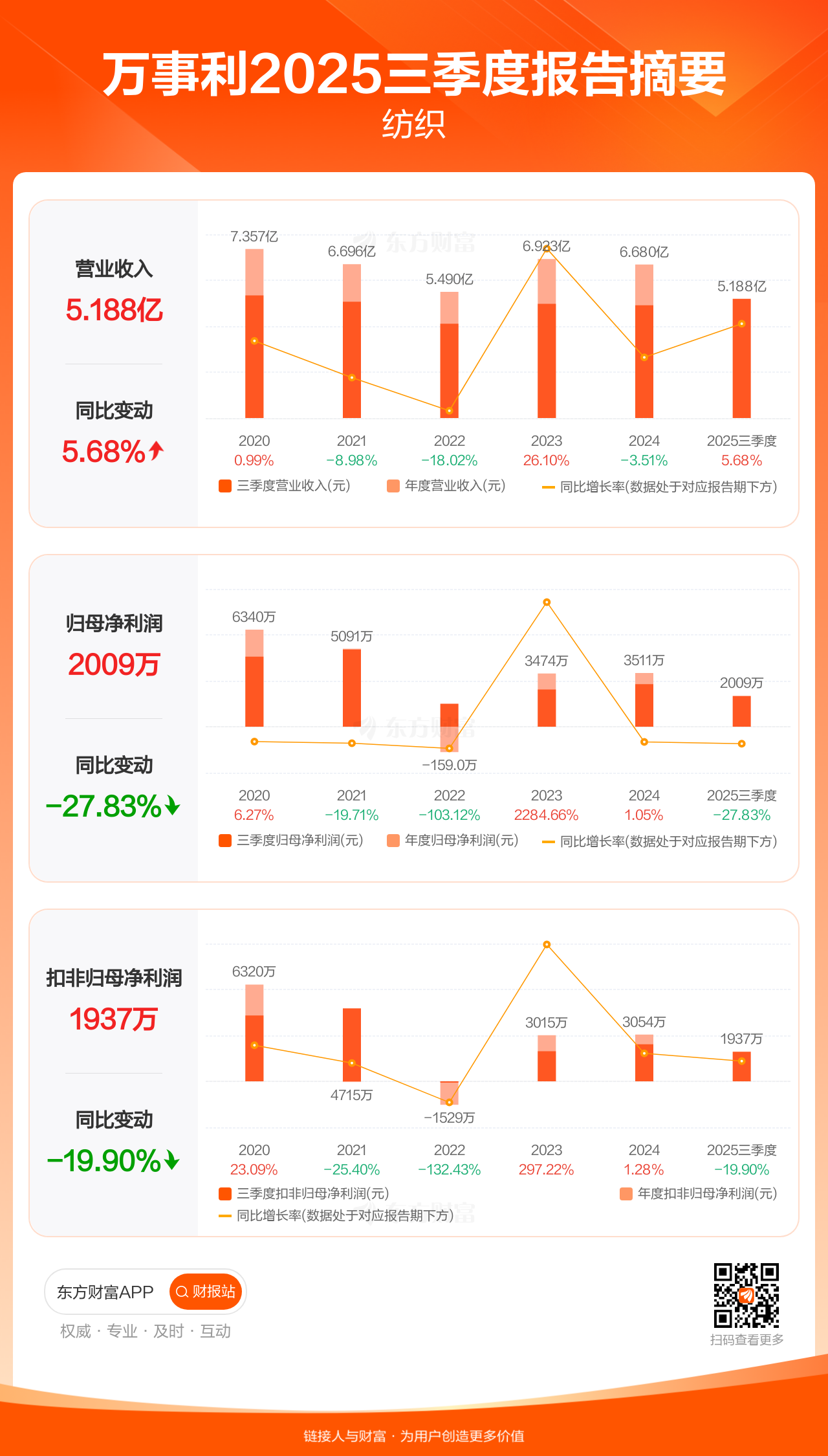 万事利10月30日发布2025年三季报显示,公司前三季实现营业收入5.19亿元,同比增长5.68%;归母净利润2008.72万元,同比下滑27.83%;扣非归母净利润1937.46万元,同比下滑19.90%。