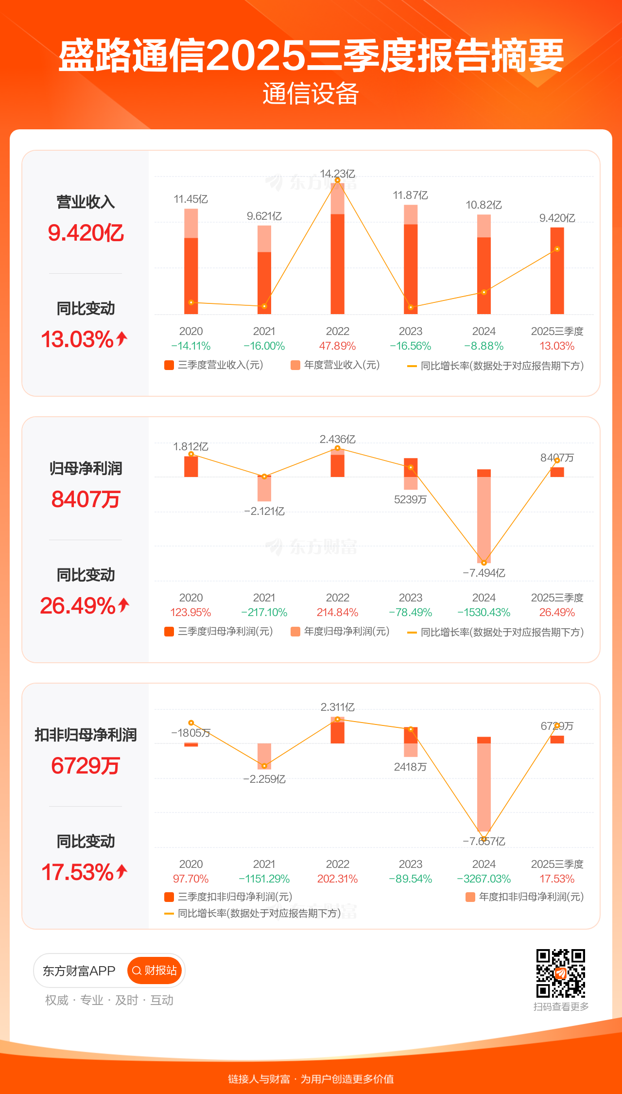 盛路通信10月30日发布2025年三季报显示,公司前三季实现营业收入9.42亿元,同比增长13.03%;归母净利润8407.21万元,同比增长26.49%;扣非归母净利润6729.32万元,同比增长17.53%。