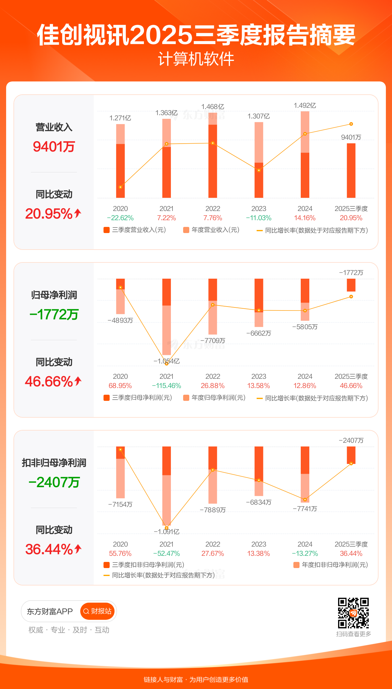 佳创视讯10月30日发布2025年三季报显示,公司前三季实现营业收入9401.06万元,同比增长20.95%;归母净利润-1771.63万元;扣非归母净利润-2406.59万元。