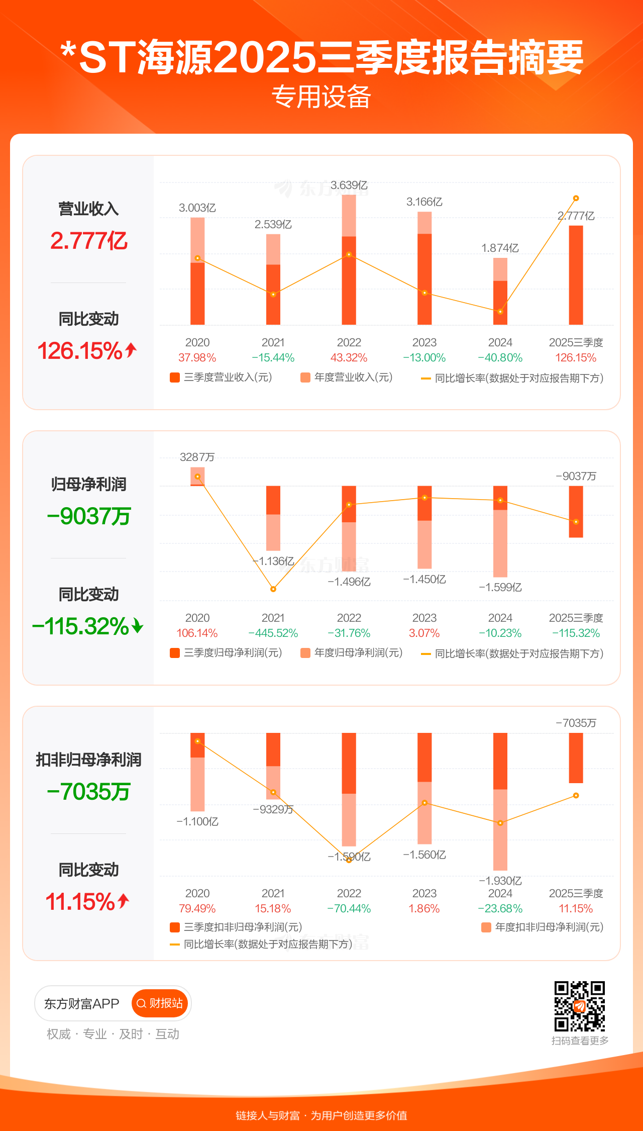 *ST海源10月30日发布2025年三季报显示,公司前三季实现营业收入2.78亿元,同比增长126.15%;归母净利润-9036.64万元;扣非归母净利润-7035.02万元