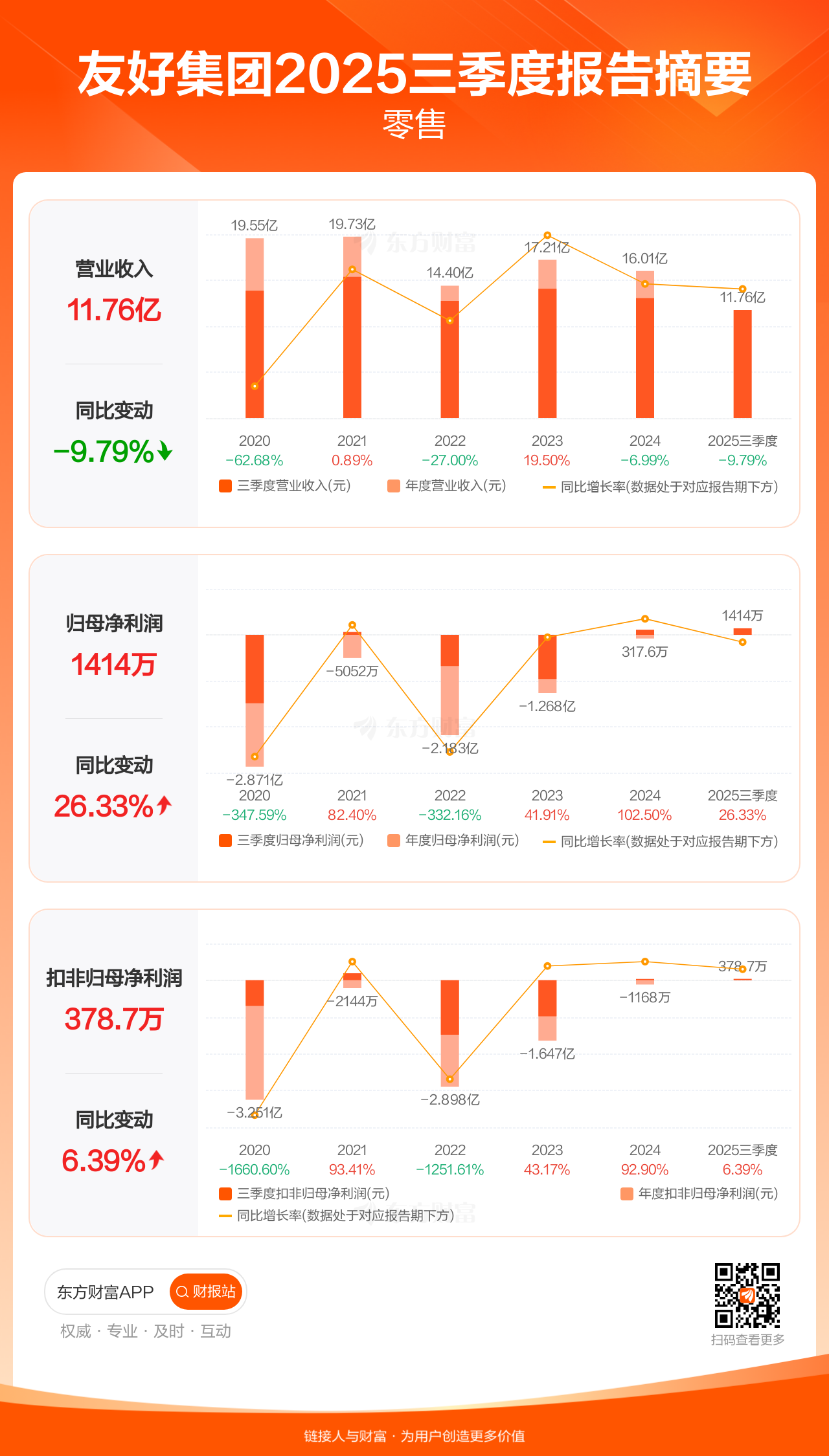 友好集团10月30日发布2025年三季报显示,公司前三季实现营业收入11.76亿元,同比下滑9.79%;归母净利润1413.62万元,同比增长26.33%;扣非归母净利润378.72万元,同比增长6.39%。