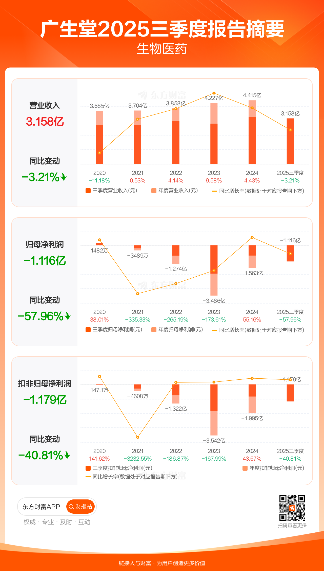 广生堂10月30日发布2025年三季报显示,公司前三季实现营业收入3.16亿元,同比下滑3.21%;归母净利润-1.12亿元;扣非归母净利润-1.18亿元。