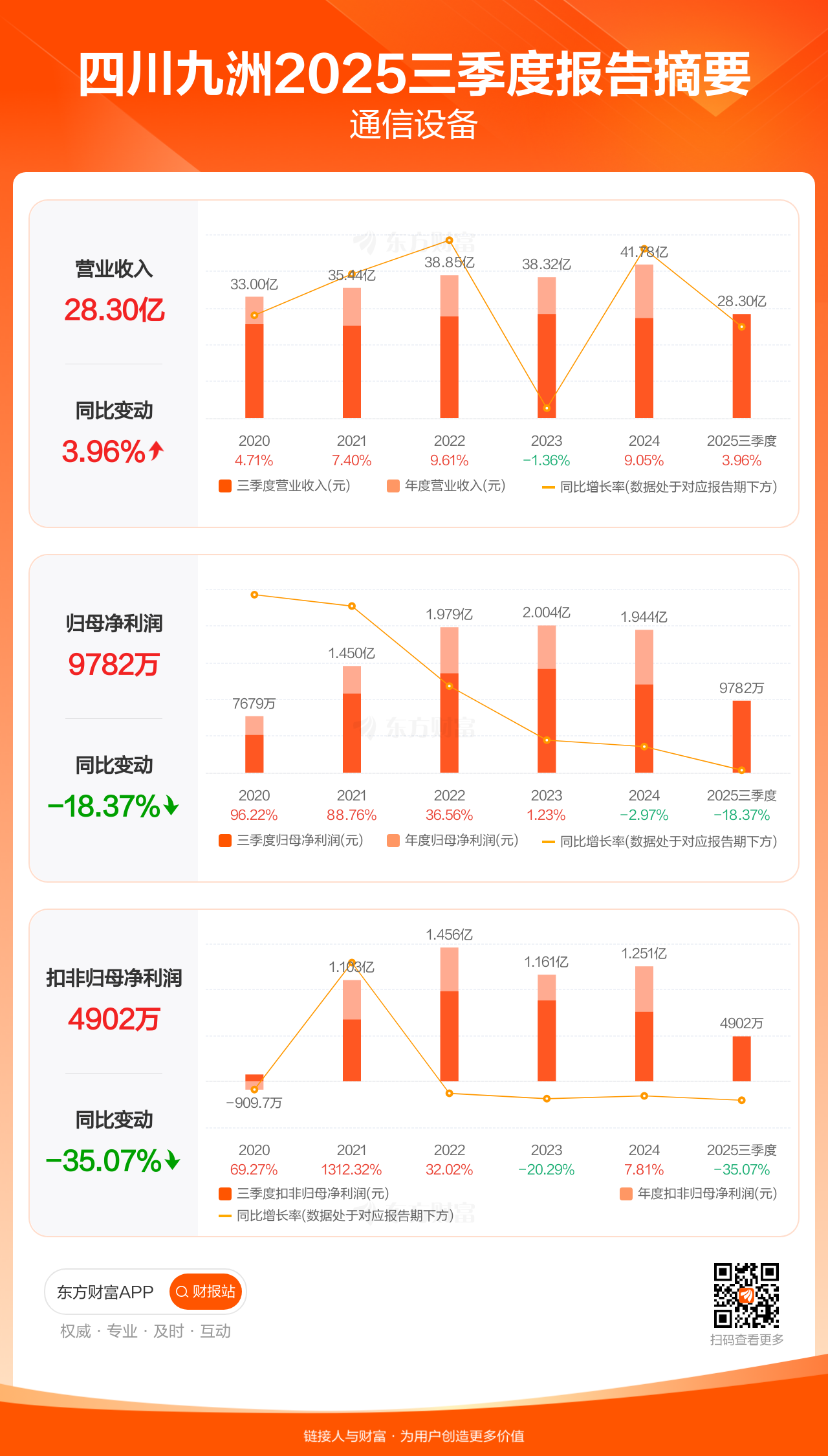 四川九洲10月30日发布2025年三季报显示,公司前三季实现营业收入28.30亿元,同比增长3.96%;归母净利润9782.40万元,同比下滑18.37%;扣非归母净利润4902.38万元,同比下滑35.07%。