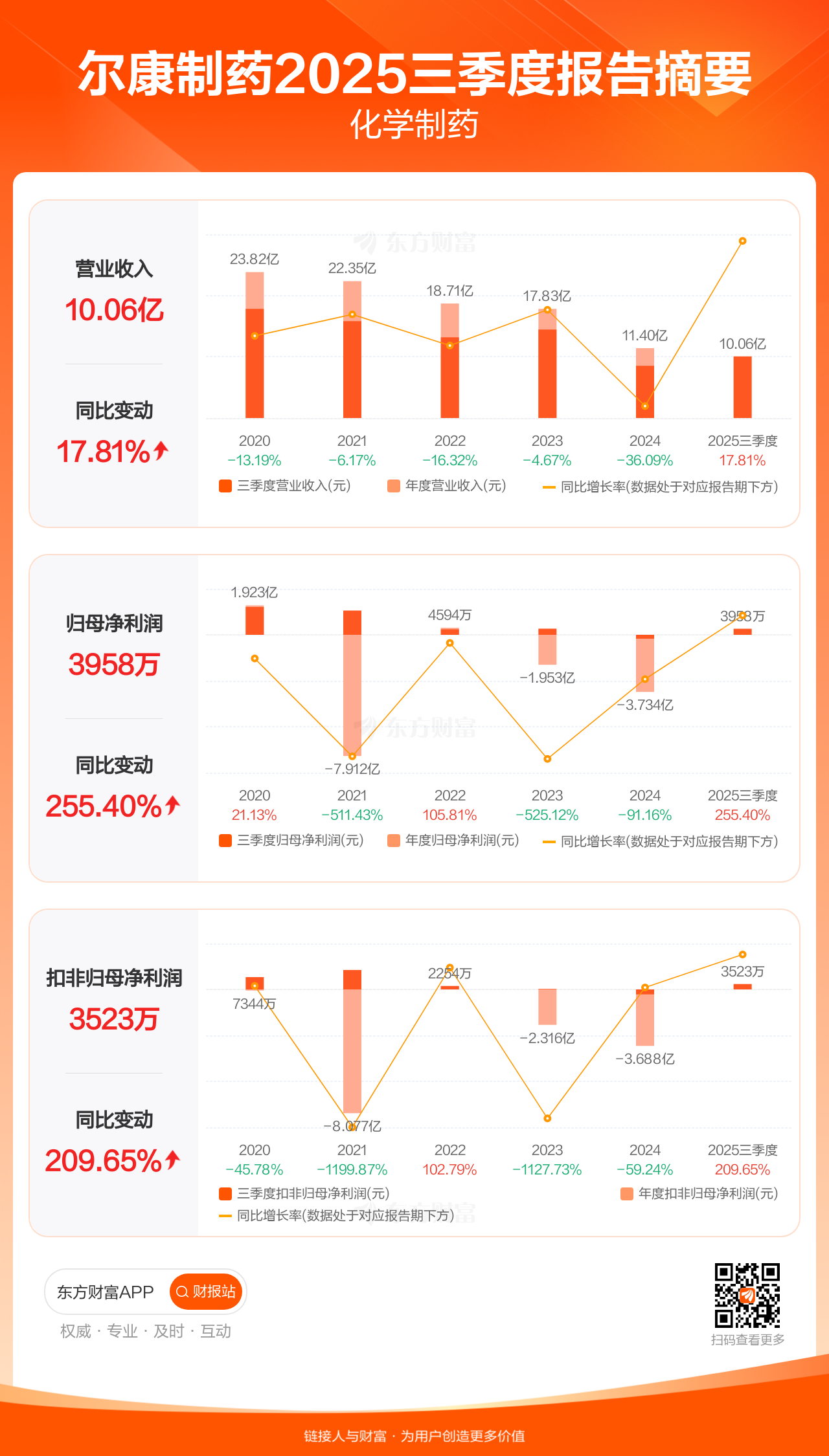 尔康制药10月30日发布2025年三季报显示,公司前三季实现营业收入10.06亿元,同比增长17.81%;归母净利润3957.59万元,同比增长255.40%;扣非归母净利润3523.03万元,同比增长209.65%。
