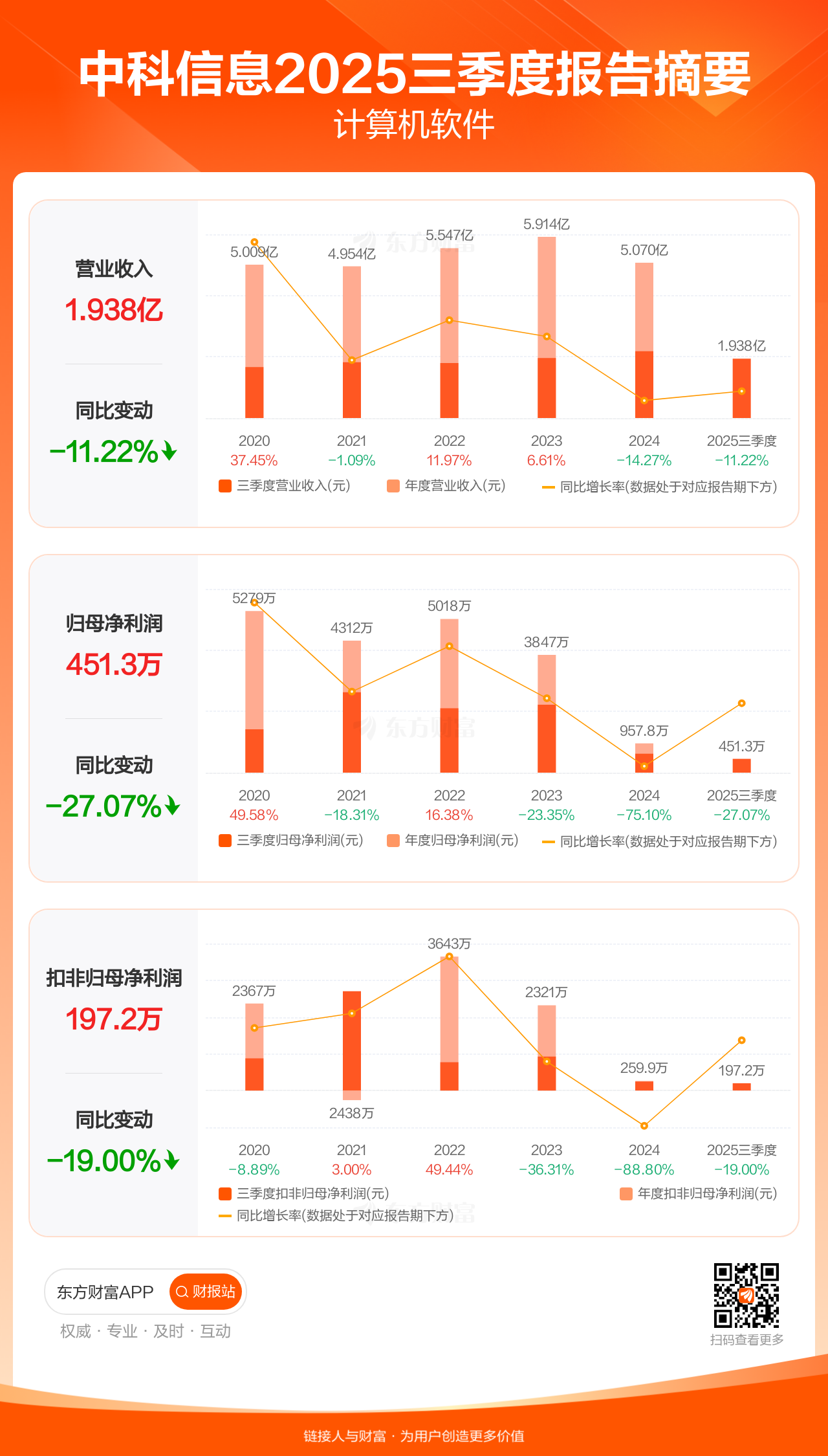 中科信息10月30日发布2025年三季报显示,公司前三季实现营业收入1.94亿元,同比下滑11.22%;归母净利润451.33万元,同比下滑27.07%;扣非归母净利润197.16万元,同比下滑19.00%。