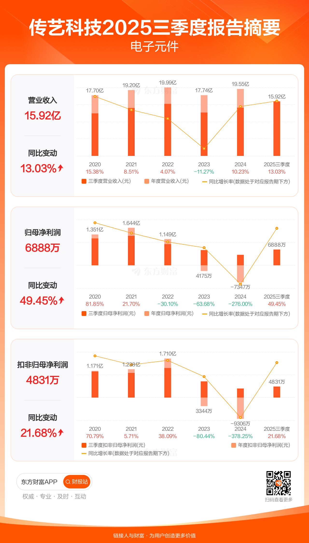 传艺科技10月30日发布2025年三季报显示,公司前三季实现营业收入15.92亿元,同比增长13.03%;归母净利润6888.29万元,同比增长49.45%;扣非归母净利润4830.95万元,同比增长21.68%。
