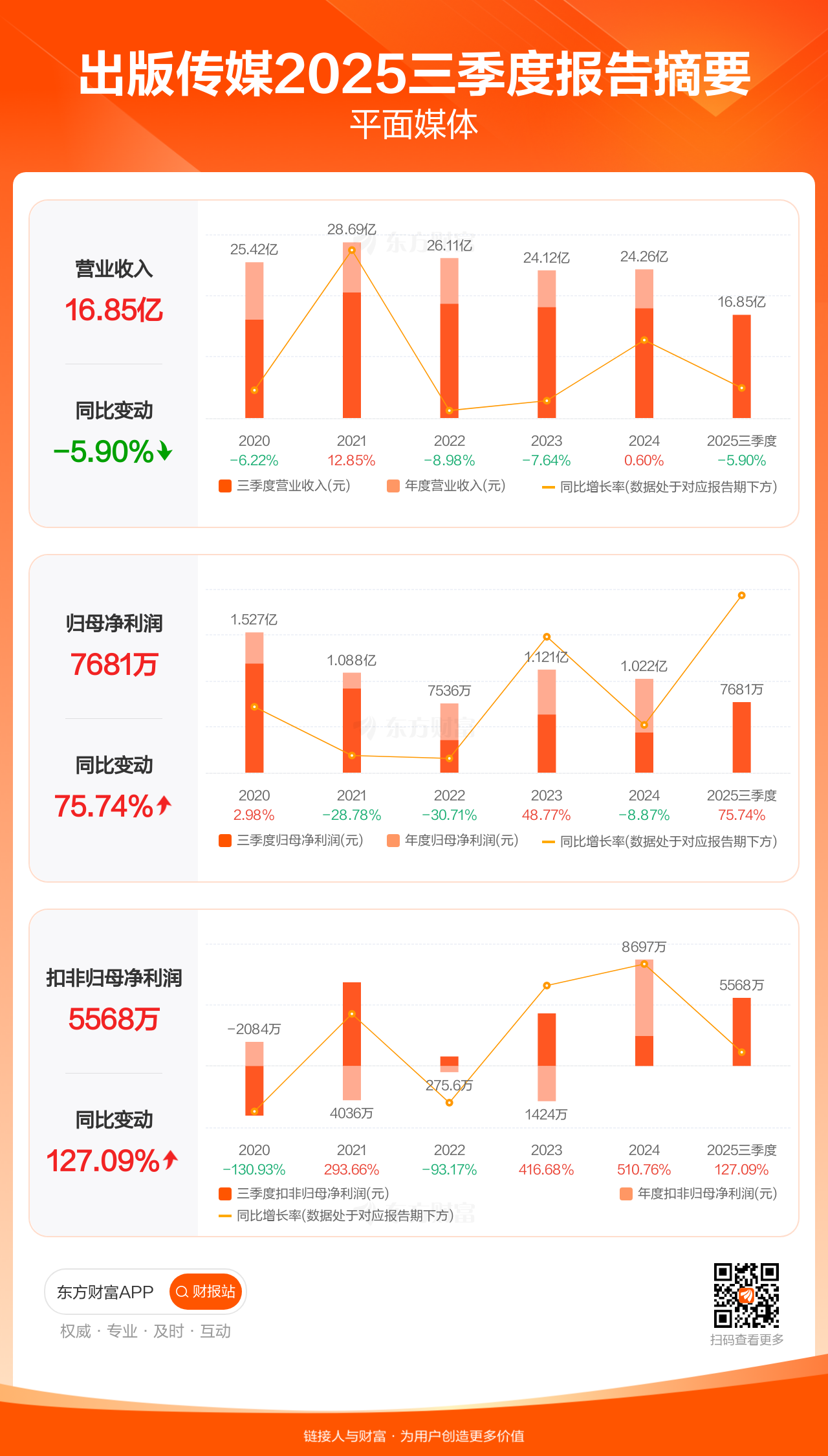 出版传媒10月30日发布2025年三季报显示,公司前三季实现营业收入16.85亿元,同比下滑5.90%;归母净利润7681.39万元,同比增长75.74%;扣非归母净利润5568.20万元,同比增长127.09%。