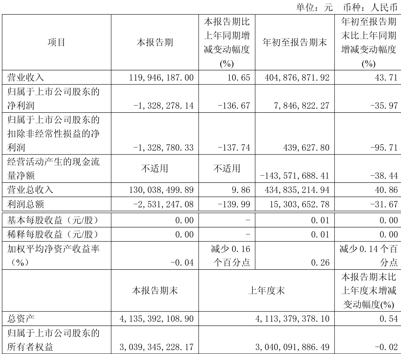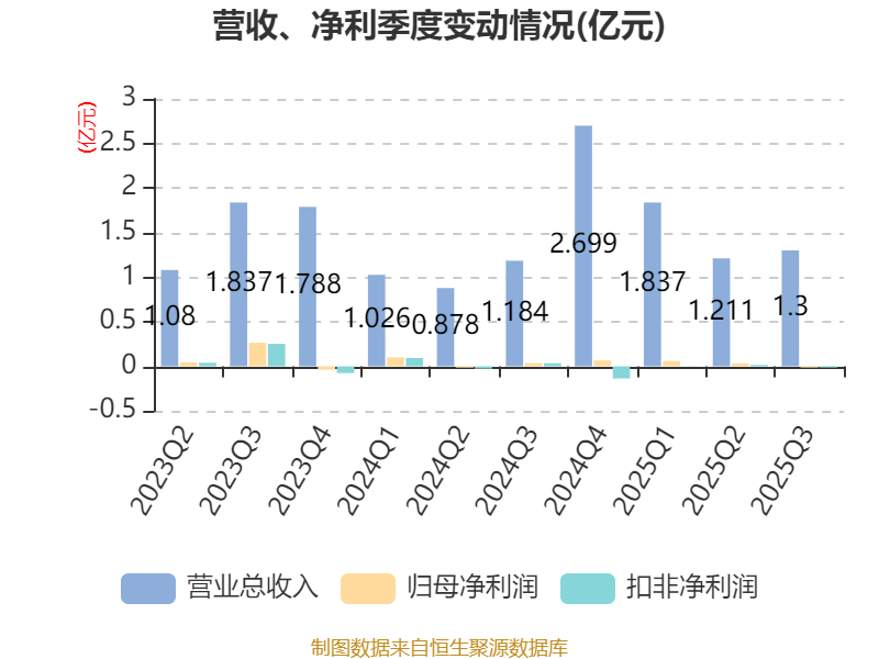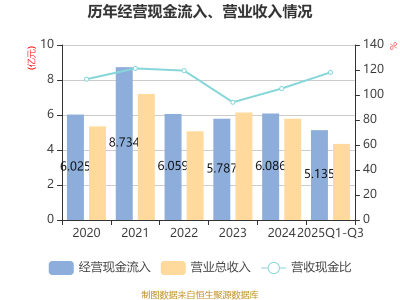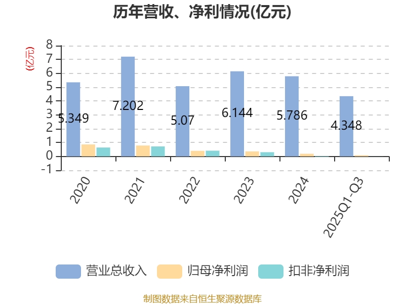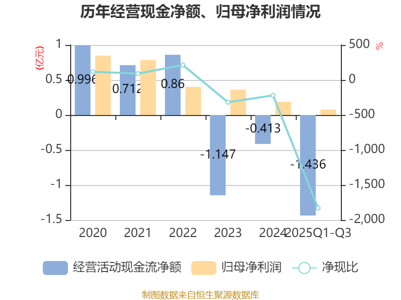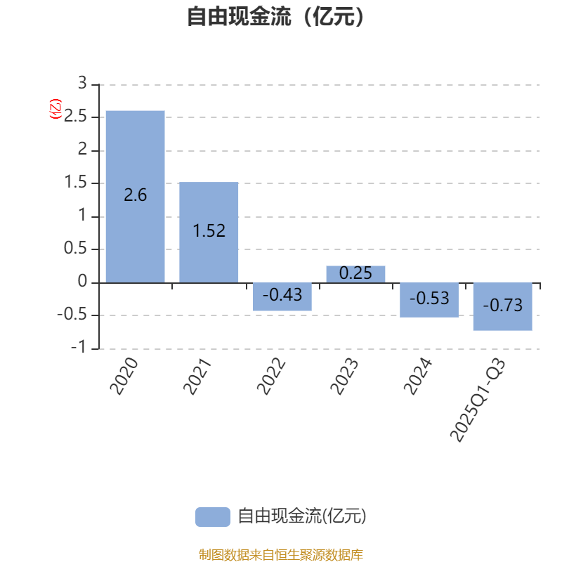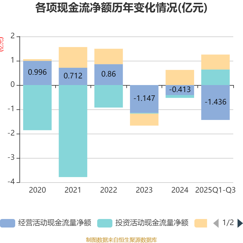 2025年前三季度,公司经营活动现金流净额为-1.44亿元,同比减少3986.33万元;筹资活动现金流净额6153万元,同比减少880.55万元;投资活动现金流净额6400.73万元,上年同期为-952.11万元。